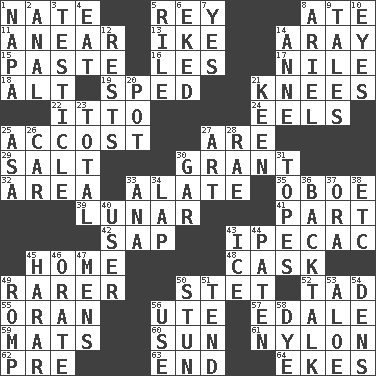 ACROSS 1. Nathan's nickname 5. Marina Del _, California 8. Had dinner 11. Approach 13. Mamie's mate 14. Like ___ of sunshine 15. Thick mixture 16. French article 17. The longest river in the world 18. Keyboard modifier key 19. Broke a traffic law 21. Leg joints 22. "Tell ____ the Marines!" 24. Snakelike fish 25. Buttonhole 27. "We ___ not amused" (Victoria) 29. Table seasoning 30. Monetary aid 32. Type of rug 33. Having winglike extensions 35. Mitch Miller's instrument 39. Type of eclipse 41. Role in a play 42. Plant excrement 43. Medicinal drug used to evoke vomiting 45. Dwelling 48. Keg 49. More uncommon 50. Proofreading order 52. Small amount or degree 55. Northwest Algerian city 56. Shoshoni 57. Peak District village in England 59. Floor coverings 60. Player for Phoenix 61. High-strength synthetic material 62. Before (prefix) 63. Conclude 64. Makes supply last DOWN 1. California wine valley 2. Of or related to the anus 3. One of the two male reproductive glands 4. Ingest 5. Cause heat under the collar 6. Made supply last 7. It is so 8. Satellite of Uranus 9. Falsehoods 10. Snake ____ (dice throw) 12. Musical pauses 14. Queen of England 1702-14 20. Plant holder 21. Peachy ____! 23. "_____ Recall" 25. White ___ sheet 26. Auto 27. Tate display 28. Actress Charlotte 30. Slender fish 31. Drinks excessively 33. Santa ___, CA 34. Pet locale 36. Sass 37. Mouth or opening 38. And so on (abbr.) 40. One who uses or employs something 43. Frozen water 44. Eucharist need 45. Ethiopian city, capital of Harari 46. Speak pompously 47. Not women's 49. Frolic 50. Surprise greatly 51. Watch over 53. _ vera 54. Hiding places for outlaws 56. Purpose 58. Color