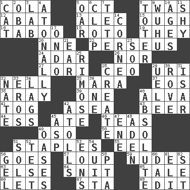 ACROSS 1. Root beer relative 5. Sep. follower 8. It was, poetically 12. Blind as ____ 13. Actor Baldwin 15. Ending for "Through" and "Enough" 16. Off limits 18. Printing process, for short 19. Those things 20. Compass dir. 22. Son of Zeus who helped slay Medusa 24. The sixth month of the Jewish calendar 26. Not either 27. Australian parrot (variant) 28. Corporate head (abbr.) 29. RI univ. 32. 1994 drama film starring Jodie Foster 35. Hindu Mythology: god of death 37. Greek goddess of the dawn 38. Like ___ of sunshine 39. Single 40. Inventor's middle name 41. Coat; cloak 42. At sea 43. Fermented drink made from hops 44. Curvy letter 45. Had dinner 46. Beverages made from leaves 49. Bear (Spanish) 50. Inside; within (prefix) 51. Paper fasteners 55. Snakelike fish 56. Travels 57. Central Nebraska county 59. Unadorned figures 63. Otherwise 64. In a ____ (agitated or irritated) 65. Lie 66. Allows 67. R.R. building 68. Prepare for publication DOWN 1. Domesticated feline 2. Chief or king in Benin or Nigeria 3. Experiment locale 4. Lacking a tonal center or key 5. Boat paddle 6. Hoof sound 7. False hair 8. Carrier 9. Chinese city south-southwest of Nanjing 10. Eras 11. Like a shrinking violet 14. Pupil covering 17. Southwest Nigerian state 21. Ewer handle 23. "Barney Miller" actor Jack 25. Full of chinks, cracks, or crevices 28. Cause to be 29. Ubangi River tributary 30. Be footloose 31. Austrian river, tributary to the Danube 32. Nathan's nickname 33. Greek god of love 34. Falls behind 36. A saturated hydrocarbon 40. Utter; complete 42. Ringlike coral islands and reefs 45. Cleo's killer 47. Compass dir. 48. Arabian gulf 49. Fertile tracts in a desert 51. Flatfish 52. Trial 53. Immeasurably long periods of time 54. Set of matching outer garments 56. Set 58. Parent Teacher Assoc. 60. June honoree 61. Biblical high priest 62. Arrange properly for use