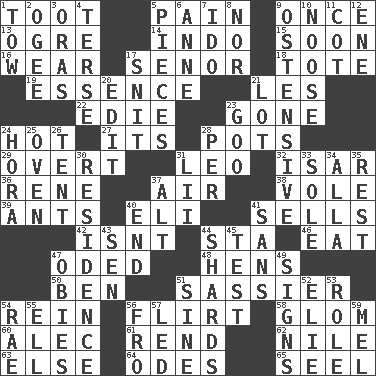 ACROSS 1. A blast of a horn 5. Ache 9. At one time in the past 13. Legendary monster 14. _ china 15. Within a short period 16. Erode 17. Sir (Sp.) 18. Lug 19. Gist 21. French article 22. Singer Brickell 23. Went 24. Being at a high temperature 27. ___ a Wonderful Life 28. Cooking vessels 29. Unconcealed 31. Lion 32. Austrian river, tributary to the Danube 36. French philosopher Descartes 37. Atmosphere 38. Grand slam 39. Pismires 40. Biblical high priest 41. Exchanges for money 42. Is not 44. R.R. building 46. Erode 47. Wrote a lyric poem 48. Coop moms 50. Benjamin's nick name 51. More disrespectful 54. It's straight from the horse's mouth 56. Seductive woman who exploits men 58. Take by theft 60. Actor Baldwin 61. Tear apart 62. "Death on the ____" 63. Otherwise 64. Lyric poems 65. Stitch closed the eyes of (a falcon) DOWN 1. Pull behind 2. Double curve, resembling the letter S 3. Mouths or openings 4. Laconic 5. Components 6. Queen of England 1702-14 7. Wedding promise 8. And not 9. Clearly or manifestly demonstrative 10. Trap for birds or small mammals 11. Small bed 12. Compass dir. 17. In a ____ (agitated or irritated) 20. Prepare for publication 21. Car dealer's back yard 23. Thick or sticky substance 24. Israeli folk dance 25. Baking chamber 26. Portable shelter 28. For each 30. Home 31. Cards in a Roman deck? 33. Not divided or shared with others 34. Silent film actress Nazimova 35. State of inaction 37. Keyboard modifier key 40. Conclude 41. Without 43. Elected rep. 44. Broken pieces 45. Trial 47. Off-Broadway awards 49. Public displays of written messages 51. Trig term 52. Writer Wiesel 53. Hero or heavy, e.g. 54. Actress Charlotte 55. Pipe bend 56. From 57. Directed 59. Cartoonist voice _ Blanc