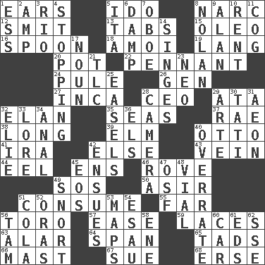 ACROSS 1. Hearing organs 5. Wedding promise 8. Drug cop 12. Stricken, poetically 13. Bar bills 15. Butter sub 16. Soup utensil 18. Mine, in Marseilles 19. Austrian-born American filmmaker Fritz 20. Plant holder 22. Pre-World Series prize 24. Whine 26. Commissioned mil. rank 27. South American Indian 28. Corporate head (abbr.) 29. "One Day ___ Time" 32. Enthusiasm 35. Oceans 37. Actress Charlotte 38. Yearn 39. Shade tree 40. Von Bismarck 41. Retirement account (abbr.) 42. Otherwise 43. Distinctive style or manner 44. Snakelike fish 45. Followers of ems 46. Be footloose 49. Mayday 50. SW Saudi Arabia district 51. Eat 55. At a great distance 56. "Corrida" creature 57. Relaxation 59. Shoestrings 63. Having or resembling wings 64. Connect, as a bridge 65. Small boys 66. Vertical spar for supporting sails 67. Institute legal proceedings 68. Celtic language DOWN 1. Curvy letter 2. Electrical Unit 3. River (Sp.) 4. Ceasing 5. Call ___ day 6. Moist 7. Mitch Miller's instrument 8. Pitcher Ryan 9. ____ Jay Lerner 10. Monthly bill 11. Gear tooth 14. Scorches 17. Part of speech 21. Affectionate concern, for short 23. Modern: prefix 25. Artist's stands 28. Device for capturing images 29. Johnson of "Laugh-In" 30. Jacques of French films 31. Period of immesurable duration 32. Writer Wiesel 33. Old wives' tales, e.g. 34. Of or related to the anus 36. Raised railways 40. Make much ado about nothing 42. Follows as a consequence or result 45. Greek goddess of the dawn 47. Order of Saint Francis (abbr.) 48. Small bottle 49. Derisive sound 51. Root beer relative 52. Mouths or openings 53. Atlas contents 54. Son of Isaac 56. Scottish cap 58. Compass dir. 60. Automobile 61. Begley and Asner 62. Compass dir.