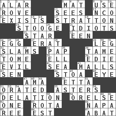ACROSS 1. Having or resembling wings 5. Floor covering 8. Purpose 11. Be footloose 12. Observes 13. Non-commissioned officer (abbr.) 14. Is extant 17. Ski resort town in Vermont 19. Moe Howard, for one 21. Foolish or stupid persons 22. Play the lead 23. Car or cant ending 24. Ovum 27. Part of Q.E.F. 29. Part of a journey 32. Hits or strikes with great force 34. Infant food 36. Docile 37. Heavy book 38. Pipe bend 39. Singer Brickell 40. Tending to cause great harm 41. Ocean 42. Shopping centers 43. Elected rep. 44. Portico 46. Sight organ 47. Housemaid (var.) 50. Singer James 52. Declaimed 55. Michaelmas daisies 57. Conveyance 59. Threatening words 62. Single 63. Round or rotation of duties 64. California wine valley 65. To separate or throw off 66. Eastern Standard Time (abbr.) 67. Blind as ____ DOWN 1. "We ___ not amused" (Victoria) 2. Brine-cured salmon 3. Advice 4. Musical pauses 5. Was introduced to 6. Nest on high 7. Sadhe (variant) 8. To (old English) 9. Native of Scotland 10. Immeasurably long periods of time 12. Compass dir. 15. Hauls 16. Fly high 18. Metal container 20. Wine fruits 24. _____ Park, CO 25. Michael Jackson trademark 26. Street urchin 28. Lies 29. Dipping utensil 30. Poet Dickinson 31. Honkers 33. Cartoonist voice _ Blanc 35. Food holders 36. Afternoon social gathering 42. Mother 45. Von Bismarck 47. "One Day ___ Time" 48. Distance measurement (Brit.) 49. Goodbye (Sp.) 51. Sports stadium 52. Scent 53. French philosopher Descartes 54. Toward shelter 55. Santa ___, CA 56. Thick slice 58. Baseball player Mel 60. Health resort 61. Consume