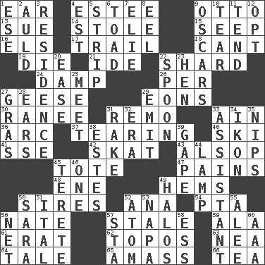 ACROSS 1. Hearing organ 4. First name in cosmetics 9. "Beetle Bailey" pooch 13. Take to court 14. Took without asking 15. Ooze 16. Raised railways 17. Hang back 18. Patter 19. Pass on 21. Binary compound 22. Broken piece 24. Moist 26. For each 27. Honkers 29. Immeasurably long periods of time 30. The wife of a rajah (variant) 31. San ____ (Riviera town) 33. The 18th letter of the Arabic alphabet 36. Curve 37. Rending 40. What Jean-Claude Killy likes to do 41. Compass dir. 42. Three-handed card game 43. Columnist Joseph or Stewart 45. Carryall 47. Aches 48. Compass dir. 49. Is hesitant and indecisive 50. Founders of families 52. Santa ___, CA 54. Parent Teacher Association (abbr.) 56. Nathan's nickname 57. Having lost freshness 59. Insect wing 61. Part of Q.E.F. 62. Traditional theme or motif 63. Teachers' org. 64. Falsehood 65. Collect or gather 66. Beverage made from leaves DOWN 1. Compass dir. 2. Old (Scot.) 3. Home 4. Eastern Standard Time (abbr.) 5. Empty completely 6. Frog relative 7. Writer Wiesel 8. Snakelike fish 9. Motion picture awards 10. Rend 11. Be inclined (to) 12. Elect 20. Relaxation 22. Soup utensil 23. Layer 25. Confront 27. Pate de foie ____ 28. Hearing organs 29. Give off 31. Immoral or dissolute person 32. Period 33. Helper 34. Image 35. Pinches, bites 38. _____ Park, CO 39. Open wide 44. Desk light 45. Cylindrical with tapered ends 46. Single 49. Saint headwear 50. "Two Mules for Sister ____" 51. Slanted text style (abbr.) 52. Smallest unit of an element 53. California wine valley 55. Toward shelter 56. Fish or hair follower 57. R.R. building 58. Curvy letter 60. Auto club (abbr.)