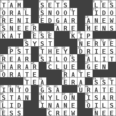 ACROSS 1. Scottish cap 4. Arranges properly for use 8. French article 11. Spoken 13. Snob 15. Wedding promise 16. Painter Guido (1575-1642) 17. _ Allan Poe 18. Afresh 19. Scornful expression 21. "We ___ not amused" (Victoria) 22. Not women's 23. Krazy ___ of comics 24. Compass dir. 27. Sleep 29. System (abbr.) 30. Impudent aggressiveness 34. Pacific Standard Time (abbr.) 36. Those things 39. Frees from moisture 40. Hitchcock's "____ Window" 41. Grain storage towers 43. Came down and settled, as after flight 44. Ethiopian city, capital of Harari 46. A slight indication 47. Commissioned military rank (abbr.) 48. Speak pompously 49. Assign a rank or rating to 51. Beverage made from leaves 53. Period 54. Fast jet (abbr.) 57. To the inside or interior of 60. Girls' org. (abbr.) 63. A salt of uric acid 65. Comedian Laurel of Laurel & Hardy 66. High-strength synthetic material 69. Austrian river, tributary to the Danube 70. Flaplike covering 71. Lacking in sense or substance 72. Petroleums 73. Curvy letter 74. Group working together 75. Born DOWN 1. Cod relative 2. Sports stadium 3. French painter Edouard 4. Compass dir. 5. Conclude 6. Ancient Roman robe 7. Fly high 8. Actor's bit 9. Paradise 10. Sty mamas 12. Whopper 14. Long journey 18. Electrical Measurement 20. Marina Del _, California 25. Fast planes 26. Principle of right and wrong 28. Indiana (abbr.) 29. Ski resort town in Vermont 31. Cause heat under the collar 32. Distinctive style or manner 33. Eastern Standard Time (abbr.) 34. Lightbulb-shaped fruit 35. "Two Mules for Sister ____" 37. Pipe bend 38. You are 40. 17th letter of the Greek alphabet 42. Shrivel 45. To riddle 50. The 19th letter of the Greek alphabet 52. Hindu god of fire 54. Indian antelope 55. Having lost freshness 56. Laconic 57. Small island 58. Nuclear Threat Initiatives 59. Bits 61. Synchronize (abbr.) 62. Having or resembling wings 64. _ de Janeiro 67. Single 68. ___ Haven, CT