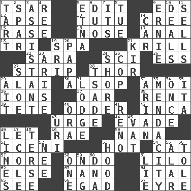ACROSS 1. Russian ruler of old 5. Prepare for publication 9. Begley and Asner 12. Domed church section 13. Ballerina skirt 14. Algonquian 15. Raze (variant) 16. Olfactory organ 17. Of or related to the anus 18. Three (prefix) 19. Health resort 21. The principal food of baleen whales 22. "Two Mules for Sister ____" 24. _-fi 26. Curvy letter 27. Remove all contents or possession from 28. Son of Odin 29. Jai ____ 30. Columnist Joseph or Stewart 32. Mine, in Marseilles 36. Charged atoms 37. Boat paddle 38. Monthly bill 39. Wig 40. More peculiar 42. South American Indian 43. Goad 44. Elude 46. Allow 49. Actress Charlotte 50. Nanny 51. Ancient Celtic tribe of eastern Britain 53. Being at a high temperature 54. Feline 57. Greater amount 58. Southwest Nigerian state 61. _ and Stitch 62. Otherwise 63. Billionth: prefix 64. Slanted text style (abbr.) 65. Observe 66. Mild oath 67. Jane of fiction DOWN 1. Small pie 2. Practice fight 3. Aide 4. To riddle 5. Inactive volcano in Sicily 6. Superhero pair 7. ___ a Wonderful Life 8. Third day of the wk. 9. Bert's buddy 10. Allots cards 11. Exchanges for money 14. 4-wheeled motor vehicle 19. _ Lanka 20. Dad 21. Apertif with cassis 23. Originate 24. Dinah or Pauly 25. Police officer (slang) 27. _ gin 28. Sadhe (variant) 29. Small island 31. Inn 32. Believer in; advocate of (suffix) 33. Ananias' fault 34. At one time in the past 35. Call ___ day 40. Mouth or opening 41. Former U.S. Attorney General Janet 43. RI univ. 45. Large container 46. Citrus fruits 47. Learning spot: Fr. 48. Laconic 52. Born 53. Parka part 55. Having or resembling wings 56. Lacquered or enameled metalware 58. Single 59. Tired old horse 60. Heredity factor (abbr.) 61. Falsehood