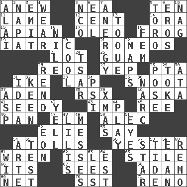 ACROSS 1. Afresh 5. Teachers' org. 8. "___ Little Indians" 11. Unable to walk 12. Penny 14. Mouth or opening 15. Bee-related 17. Butter sub 18. Toadlike animal 19. Of or pertaining to medicine 21. Lover boys 23. Car dealer's back yard 25. Island territory of the United States 26. Vintage cars 27. Slangy assent 28. Parent Teacher Assoc. 31. Mamie's mate 33. Pet locale 35. Snout, nose 37. An important port of Yemen 38. Acura sports coupe 40. "____ silly question..." 41. Sleazy 43. Naughty child 45. To riddle 46. Baking dish 47. Shade tree 50. Actor Baldwin 52. Writer Wiesel 53. Declare 54. Ringlike coral islands and reefs 56. Last past 61. Songbird 62. Capri or Wight 65. Vertical member of a panel or frame 66. ___ a Wonderful Life 67. Observes 68. First man 69. Fish or hair follower 70. Fast jet (abbr.) 71. Former U.S. Attorney General Janet DOWN 1. Jai _ 2. California wine valley 3. Give off 4. Erode 5. Non-commissioned officer (abbr.) 6. Snakelike fish 7. Disorder of the immune system 8. "Corrida" creature 9. Greek god of love 10. Tired old horse 13. Woman's close-fitting hat 16. Mediterranean tributary 18. Opposite of masc. 20. Calm and collected 22. Atlas contents 24. Russian ruler of old 26. Tear apart 28. Introduce or present, as a question 29. Puff or smoke 30. "One Day ___ Time" 31. The content of cognition 32. Peachy ____! 34. Air pressure measure (abbr.) 36. Drug cop 37. Cleo's killer 39. Dec. holiday 42. Shout 44. Live dramatic performance 48. Ms. Damita and namesakes 49. Makes clutter 51. Snake ____ (dice throw) 52. Age 54. Johnson of "Laugh-In" 55. Trial 57. Play the lead 58. Periodic rise and fall of the sea level 59. Style 60. San ____ (Riviera town) 61. Acquire through effort 63. French article 64. Eastern Standard Time (abbr.)