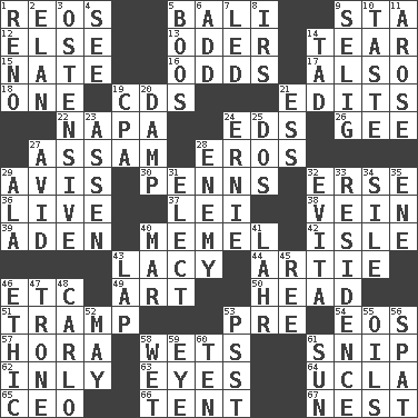 ACROSS 1. Vintage cars 5. Indonesian resort city 9. R.R. building 12. Otherwise 13. River in Europe 14. Separate forcefully 15. Nathan's nickname 16. Probability 17. In addition 18. Single 19. Music discs 21. Proofreads 22. California wine valley 24. Begley and Asner 26. Unit of force equal to gravity 27. Indian state 28. Greek god of love 29. Advice 30. Actor Sean's family 32. Celtic language 36. Not recorded 37. Luau accessory 38. Distinctive style or manner 39. Arabian gulf 40. Klaipeda city 42. Capri or Wight 43. Made of lace 44. Nick name for Arthur 46. And so on (abbr.) 49. Nonscientific branch of learning 50. Froth on beer 51. _____ steamer (cargo ship) 53. Before (prefix) 54. Greek goddess of the dawn 57. Israeli folk dance 58. Moistens 61. Clip 62. In an inward manner 63. Sight organs 64. Southern CA. univ. 65. Corporate head (abbr.) 66. Portable shelter 67. A home for chicks DOWN 1. Former U.S. Attorney General Janet 2. Flair 3. Clearly or manifestly demonstrative 4. Perceive with the eye 5. Scornful sounds 6. Say or write further 7. Directed 8. Big collection agency 9. Former Milwaukee Brewers owner Bud 10. Clothes sense 11. Came up 14. Bit 19. Numbers guy (abbr.) 20. Moist 21. Curvy letter 23. NE Netherlands city 24. Bert's buddy 25. Two (Sp.) 27. Enthusiastic 28. Foe 29. In the manner of 31. Choose 32. Webber/Rice musical 33. Dwelling 34. Filth; sediment 35. Compass dir. 40. Impair 41. Cowardly lion portrayer 43. Infant locale 45. To riddle 46. Principle of right and wrong 47. Marketplace scale 48. Monte _, Las Vegas Hotel/Casino 52. Fifth month 53. Inconspicuous attention getter 55. Lubricates 56. Petty quarrel 58. Dripping 59. Sight organ 60. Nine, plus one 61. Player for Phoenix