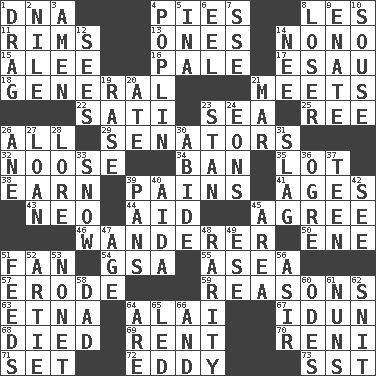 ACROSS 1. Heredity factor (abbr.) 4. Sliced desserts 8. French article 11. Basketball hoops 13. Singles 14. Words to Nanette 15. Toward shelter 16. Diluted with white 17. Son of Isaac 18. Commissioned military rank 21. Confronts 22. Suttee (variant) 23. Ocean 25. To riddle 26. Everything 29. Legislators 32. Trap for birds or small mammals 34. Forbid 35. Car dealer's back yard 38. Merit 39. Aches 41. Grows older 43. Modern: prefix 44. Assist 45. Match 46. Nomad 50. Compass dir. 51. Avid follower 54. Girls' org. (abbr.) 55. At sea 57. Eat (away) 59. Thinks logically 63. Inactive volcano in Sicily 64. Mountain range southwest of Kyrgyzstan 67. Goddess of spring and wife of Bragi 68. Passed on 69. Monthly bill 70. Painter Guido (1575-1642) 71. Put into a specified state 72. Whirlpool 73. Fast jet (abbr.) DOWN 1. To draw with force 2. Mediterranean tributary 3. So be it 4. Cotton for raincoats, e.g. 5. _ tizzy (2 wds.) 6. Snakelike fish 7. Compass dir. 8. Failure 9. Related on the mother's side 10. Lush 12. Observes 14. Born 19. Raze (variant) 20. Had dinner 21. Impair 23. Comedian Laurel of Laurel & Hardy 24. Immeasurably long periods of time 26. A saturated hydrocarbon 27. Grant temporary use of 28. Old wives' tales, e.g. 30. Tolerate 31. Volcanic refuse 33. Frozen precipitation 36. Legendary monster 37. Adolescent 39. Baking dishes 40. Opera by Verdi 42. Observe 45. Length times width 47. Grow older 48. Noteworthy scarcity 49. Compass dir. 51. Eats 52. Nick name for Arthur 53. Music written for nine 56. SW Saudi Arabia district 58. Male parent 60. Lyric poems 61. Religious women 62. In a ____ (agitated or irritated) 64. "We ___ not amused" (Victoria) 65. Directed 66. Added to