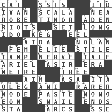 ACROSS 1. Feline 4. Fast planes 8. It would 11. _ the terrible 13. Any of the three canals of the cochlea 15. Teachers' org. 16. Loose flowing garment 17. Southeast Indonesia island 18. Arabian gulf 19. Disturbances 21. Put into a specified state 22. Yearn 23. Wedding promise 24. Cask 27. Snakelike fish 29. Opera by Verdi 30. Pitcher Ryan 34. Opposite of masc. 36. Writer Wiesel 39. Vertical member of a panel or frame 40. Pack (down) 41. Boldness 43. Falsehood 44. Satellite of Uranus 46. SW Saudi Arabia district 47. Epoch 48. Distance measurement (Brit.) 49. Family _ (genealogy) 51. Direct toward a target or goal 53. White ___ sheet 54. Call ___ day 57. Cassini of fashion 60. Cuckoo 63. More valued for its uncommonness 65. Connecting point 66. Thick mixture 69. Words to Nanette 70. A really long time 71. Slow-paced one 72. Conclusions 73. R.R. building 74. Arches 75. Compass dir. DOWN 1. High-altitude cloud 2. Prevent the occurrence of 3. Off limits 4. Fast jet (abbr.) 5. _-fi 6. Scottish caps 7. A type of plum 8. Southeast Asian peninsula 9. Adolescent 10. Mild oath, euphamism for damn 12. Fish or hair follower 14. Johnson of "Laugh-In" 18. One to whom something is allotted 20. What Jean-Claude Killy likes to do 25. Locale of original sin 26. An organ shaped like a helmet 28. Followers of ems 29. Electrical Measurement 31. One who doesn't tell the truth 32. Silent film actress Nazimova 33. Born 34. Conductor's collection 35. Give off 37. Big collection agency 38. Webber/Rice musical 40. Scottish cap 42. Blunders 45. Flowery wreath 50. Hearing organ 52. Atlas contents 54. Removes the wrinkles 55. Watches over 56. Came up 57. Singles 58. Plunder 59. Pulitzer Prize-winning author Ferber 61. Nanny 62. Austrian river, tributary to the Danube 64. A saturated hydrocarbon 67. Nervous spasm 68. Raised railways