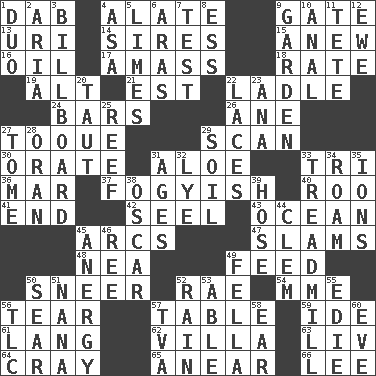 ACROSS 1. Pat or tap gently 4. Having winglike extensions 9. Yard entry 13. RI univ. 14. Founders of families 15. Afresh 16. Lubricate 17. Collect or gather 18. Assign a rank or rating to 19. The first octave above the treble staff 21. Eastern Standard Time (abbr.) 22. Dipping utensil 24. Drinking establishments 26. A saturated hydrocarbon 27. Woman's close-fitting hat 29. Examine minutely or intensely 30. Speak pompously 31. Medicinal plant 33. Three (prefix) 36. Make imperfect 37. Out of fashion; old fashioned 40. Friend of Pooh 41. Conclusion 42. Stitch closed the eyes of (a falcon) 43. Sea 45. Arches 47. Shuts with force 48. Teachers' org. 49. Nourish 50. Scornful expression 52. Actress Charlotte 54. Madame (abbr.) 56. Separate forcefully 57. Eating place 59. Binary compound 61. Austrian-born American filmmaker Fritz 62. Country estate 63. 54 in ancient Rome 64. Supercomputer manufacturer 65. Approach 66. Area sheltered from the wind DOWN 1. Superhero pair 2. Operatic vocal solo 3. Big road sign 4. White ___ sheet 5. Citrus fruits 6. Ancient river in northeast Turkey 7. Trial 8. Double-curved letter 9. Place where plants grow 10. Of or related to the anus 11. Wig 12. She-sheep 20. Strained 22. Shoestrings 23. Santa ___, CA 25. Coral ridge 27. Heavy book 28. NW Algerian seaport 29. Land 31. Ripens 32. Potassium hydroxide 33. Excercise machine 34. Wander aimlessly 35. Charged particles 38. Witty Wilde 39. Stockings 44. To starve (Brit.) 45. Disorder of the immune system 46. Portuguese money of account (variant) 49. Man or boy (slang) 50. Burn superficially 51. Grandmother 52. Water falling in drops from the sky 53. Competent 55. Singer Brickell 56. Affectionate concern, for short 57. Federal power corp. 58. Hearing organ 60. Night before a holiday