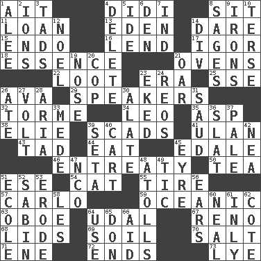 ACROSS 1. Small island 4. "You Light Up My Life" star Conn 8. Be seated 11. Grant temporary use of 13. Locale of original sin 14. Have the gumption 15. Inside; within (prefix) 16. Grant temporary use of 17. Russian composer Stravinsky 18. Substance 21. Baking chambers 22. Spoils 23. Epoch 25. Compass dir. 26. Actress Gardner 29. Orators 32. Singer Mel 34. Lion 35. Cleo's killer 38. Writer Wiesel 39. Large numbers or amounts 41. ____ Bator 43. Small amount or degree 44. Consume 45. Peak District village in England 46. Plea 50. Afternoon social gathering 51. Compass dir. 54. Feline 55. Hoop that covers a wheel 57. Monte _, Las Vegas Hotel/Casino 59. Pertaining to the sea 63. Mitch Miller's instrument 64. Allodial 67. Western Nevada city 68. Flaplike coverings 69. Land 70. Table seasoning 71. Compass dir. 72. Conclusions 73. Sodium hydroxide DOWN 1. Toward shelter 2. Charged atoms 3. Small boys 4. Erase 5. Binary compound 6. Lair 7. Working for oneself (abbr.) 8. Gurus 9. Removes the wrinkles 10. Laconic 12. Christmas carol 14. HTML Container Element 19. Characteristic smell of wine 20. Police officer (slang) 21. Rowing implement 23. Made supply last 24. Vintage cars 26. Had dinner 27. Electrical Unit 28. Roberta Peters solo 30. Having winglike extensions 31. Saudi Arabian king (1953-1964) 33. Ancient Persian 36. Narrow board 37. Light colored 39. Stalk of a moss capsule 40. Haul 42. Teachers' org. 45. Jane of fiction 47. Non-commissioned officer (abbr.) 48. Ringlike coral islands and reefs 49. Nervous spasm 51. Learning spot: Fr. 52. Unit of acoustic absorption 53. Eat (away) 56. Hearing organs 58. French article 60. Anneal 61. In an inward manner 62. ____ d'Azur (French Riviera) 64. Purpose 65. Spanish title 66. Help