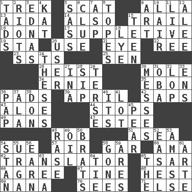 ACROSS 1. Long journey 5. Get outta here! 9. Silent film actress Nazimova 13. Opera by Verdi 14. In addition 15. Lag or linger behind 16. Do not 17. Supplementary 19. R.R. building 20. Purpose 21. Sight organ 22. To riddle 23. Fast planes 25. Elected rep. 26. Robbery 30. Undercover agent 34. Bert's buddy 35. Inky black, to poets 36. Groovy apts. 39. Showery time 42. Plant excrements 43. _ vera 44. Obstructs or blocks passage 46. Baking dishes 47. First name in cosmetics 48. Director Reiner 51. Toward the sea 54. Institute legal proceedings 57. Wind 58. Slender fish 60. Wet nurse (var.) 62. Interpreter 65. Russian ruler of old 66. Match 67. Prong on a fork 68. Behest 69. Grandmother 70. Observes 71. Otherwise DOWN 1. Small boys 2. Debaucheries 3. Ferber et al. 4. Krazy ___ of comics 5. Backtalk 6. A slight indication 7. Cleo's killer 8. Drinks excessively 9. Nonscientific branch of learning 10. Den 11. Not recorded 12. Toward shelter 15. Adolescent 18. Sodium hydroxide 20. One who uses or employs something 24. College papers 27. _ tizzy (2 wds.) 28. Small drink 29. Laconic 30. Makes clutter 31. Chief or king in Benin or Nigeria 32. Trim (branches) 33. Followers of ems 36. Infant food 37. Chicken ___ king 38. Spanish title 40. ___ a Wonderful Life 41. Car dealer's back yard 45. Lightbulb-shaped fruit 48. Raze (variant) 49. Petroleum 50. Naughty children 52. Artist's stand 53. Collect or gather 54. Comedian Laurel of Laurel & Hardy 55. Capital and largest city of Mongolia 56. Merit 58. Went 59. Ancient Greek god of war 61. Johnson of "Laugh-In" 63. Teachers' org. 64. Neckwear 65. Definite Article