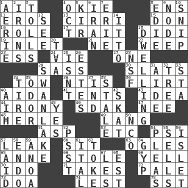 ACROSS 1. Small island 4. Migrant worker of the '30s 8. Followers of ems 11. Greek god of love 13. High-altitude cloud 15. Spanish title 16. Hero or heavy, e.g. 17. Distinguishing feature 18. "You Light Up My Life" star Conn 19. An arm off of a larger body of water 21. Fish or hair follower 22. Shed a tear 23. Double-curved letter 24. Compete 27. Single 29. Backtalk 30. Narrow boards 34. Pull behind 36. Nuclear Threat Initiatives 39. Seductive woman who exploits men 40. Opera by Verdi 41. Portable shelters 43. It may be bright or harebrained 44. Literary sarcasm 46. Neighbor of Neb. 47. Born 48. Haggard of country music 49. Austrian-born American filmmaker Fritz 51. Cleo's killer 53. And so on (abbr.) 54. Air pressure measure (abbr.) 57. Path through which fluid escapes 60. Be seated 63. Stares at amorously 65. Queen of England 1702-14 66. Fur scarf 69. Shout 70. Wedding promise 71. Proceeds 72. Light colored 73. ___ good deed 74. For fear that 75. Fast jet (abbr.) DOWN 1. Nest on high 2. Removes the wrinkles 3. For Whom the Bell _____ 4. Sep. follower 5. Apertif with cassis 6. SW Asia republic 7. One of the Great Lakes 8. Singer Brickell 9. Connecting point 10. Sever or remove by pinching or nipping 12. Observe 14. "Tell ____ the Marines!" 18. Home 20. Federal power corp. 25. Is not 26. _____ Park, CO 28. Science/research agcy. 29. Tchaikovsky ballet 31. Assistant 32. Relationship diagram 33. R.R. building 34. Become fatigued 35. Scent 37. Indiana (abbr.) 38. Lacking originality or spontaneity 40. Direct toward a target or goal 42. Three-handed card game 45. It is so 50. Non-commissioned officer (abbr.) 52. Inconspicuous attention getter 54. Entreaties 55. Exchanges for money 56. Small island 57. Put down 58. Inside; within (prefix) 59. Small Philippine buffalo 61. Slanted text style (abbr.) 62. Puff or smoke 64. Flimflam 67. French article 68. Eastern Standard Time (abbr.)