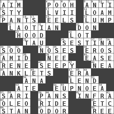 ACROSS 1. Direct toward a target or goal 4. "Silly old bear" 8. Opposed to 12. Filthy place 13. 57 in ancient Rome 14. Rich soil 15. Leg coverings 18. Snakelike fish 19. Mass 20. Of or relating to Laos or its people 22. Spanish title 23. Parka part 24. Car dealer's back yard 25. The 19th letter of the Greek alphabet 26. French poetic form 30. "Barney Miller" actor Jack 33. Olfactory organs 36. Greek god of love 37. Among 39. Born 40. Relaxation 41. French philosopher Descartes 42. Oozy 44. Teachers' org. 45. Short socks 47. Epoch 50. Santa ___, CA 51. Grant temporary use of 53. Had dinner 54. Normal relaxed breathing 57. Indian skirt 59. Baking dishes 61. Kind of red light 63. Butter sub 64. Travel on an animal 65. And so on (abbr.) 66. Comedian Laurel of Laurel & Hardy 67. Aroma 68. Portuguese money of account (variant) DOWN 1. Cleo's killer 2. Slanted text style (abbr.) 3. Non-adult bird? 4. Entreaty 5. Baking chamber 6. Petroleum 7. Part of HMS, perhaps 8. One to whom something is allotted 9. Part of speech 10. Scottish cap 11. Mischievous child 16. A blast of a horn 17. Portico 21. Goddess of spring and wife of Bragi 22. Two (Sp.) 24. French article 26. Ooze 27. SW Asia republic 28. Olfactory organ 29. Toward the sea 30. "Two Mules for Sister ____" 31. Presage 32. Pig sound 34. Singles 35. Observe 38. Accusation by an informer 42. R.R. building 43. Sharp bark 46. Compass dir. 48. Painter Guido (1575-1642) 49. Soon (poet.) 52. Postpone 53. Type of rug 54. Inside; within (prefix) 55. One who uses or employs something 56. Johnson of "Laugh-In" 57. Distress signal 58. The first octave above the treble staff 59. Adept person 60. Assist 62. Adept person