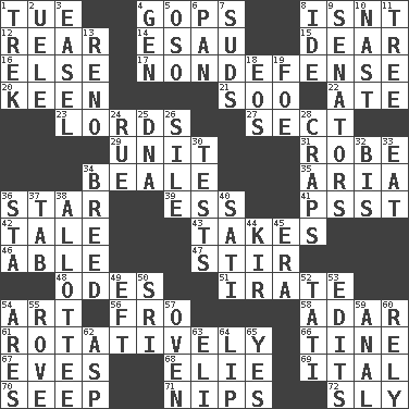 ACROSS 1. Third day of the wk. 4. Republicans 8. Is not 12. Posterior 14. He sold his birthright 15. Letter starter 16. Otherwise 17. Unrelated to defense, as in spending 20. Peachy ____! 21. "Barney Miller" actor Jack 22. Had dinner 23. Nobles 27. Religious group 29. A single undivided whole 31. Loose flowing garment 34. Memphis, Tenn. Street 35. Operatic vocal solo 36. Play the lead 39. Curvy letter 41. Inconspicuous attention getter 42. Falsehood 43. Receives possession of 46. Competent 47. Use a spoon 48. Lyric poems 51. Feeling or showing extreme anger 54. Tate display 56. From 58. The sixth month of the Jewish calendar 61. Rotating or pertaining to rotation 66. Prong on a fork 67. Nights before holidays 68. Writer Wiesel 69. Slanted text style (abbr.) 70. Ooze 71. Pinches, bites 72. Mischievous DOWN 1. Long journey 2. Ubangi River tributary 3. Artist's stand 4. Commissioned mil. rank 5. Bear (Spanish) 6. Baking dish 7. Beer foam 8. Binary compound 9. Legislators 10. Political cartoonist Thomas 11. Family _ (genealogy) 13. Former U.S. Attorney General Janet 18. Greek goddess of the dawn 19. Enemy 24. Regret 25. Heredity factor (abbr.) 26. Drop; flow; fall 28. Dice game 30. Trials 32. Altar cloth linen 33. Consume 34. A special lineage 36. R.R. building 37. Keyboard key 38. One to whom something is allotted 40. Suttee (variant) 44. Apertif with cassis 45. Period 49. Bank Draft (abbr.) 50. Indian title of respect (Mr.) 52. Jacques of French films 53. Prepares for publication 54. Ancient Greek god of war 55. Be footloose 57. Baking chamber 59. Of or related to the anus 60. Have confidence or faith in 62. Viper 63. Connecticut Ivy Leaguer 64. Mouth edge 65. It is so