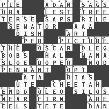 ACROSS 1. Sliced dessert 4. First man 8. Settles 12. Mouth or opening 13. For fear that 14. Relationship diagram 15. Laconic 18. Plant excrements 19. Cause heat under the collar 20. Elected representative 22. Auto club (abbr.) 23. Food container 24. Nonscientific branch of learning 25. For each 26. Photo 30. Definite Article 33. Witty Wilde 36. Cassini of fashion 37. Moves up and down 39. Actor Linden 40. Nanny 41. _ gin 42. Drug addict 44. Allow head to fall sleepily 45. Pre-World Series prize 47. Elect 50. "One Day ___ Time" 51. Prejudice 53. Shoshoni 54. Leopard's kin 57. Inside; within (prefix) 59. Margarine 61. Grain storage towers 63. Erode 64. Unshakable 65. "We ___ not amused" (Victoria) 66. Snakelike fish 67. False hair 68. Daniel's nick name DOWN 1. Cooking vessel 2. Angers 3. Having ears or earlike features 4. In addition 5. Letter starter 6. Viper 7. Mountains (abbr.) 8. Ski resort town in Vermont 9. Roberta Peters solo 10. Set 11. Perceive with the eye 16. Clip 17. Comfort 21. Through, poetically 22. Curve 24. Atmosphere 26. Light colored 27. ____ Bator, Mongolia 28. Western Nevada city 29. Mild oath 30. Cook's measure (abbr.) 31. Opening into or through something 32. Inky black, to poets 34. Went for two points 35. Head covering 38. Legislators 42. Heredity factor (abbr.) 43. Loose flowing garment 46. Had dinner 48. Sliced desserts 49. Jacques of French films 52. First course 53. Freehold land 54. An absolute certainty 55. Residence 56. Israeli folk dance 57. She-sheep 58. Born 59. Often (poetically) 60. Whopper 62. Elected rep.