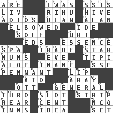 ACROSS 1. "We ___ not amused" (Victoria) 4. It was, poetically 8. Fast planes 12. 54 in ancient Rome 13. Tall New Zealand timber tree 14. Hub of activity 15. Goodbye (Sp.) 18. Uhlan (variant) 19. Actor Alda or Thicke 20. Shoved, as through a crowd 22. Binary compound 23. Flatfish 24. RI univ. 25. Begley and Asner 26. Substance 30. Health resort 33. Exchange 36. Play the lead 37. Religious women 39. Night before a holiday 40. Native american tent (variation) 41. _ vera 42. Lacking in sense or substance 44. Compass dir. 45. Pre-World Series prize 47. Mouth edge 50. Help 51. Like ___ of sunshine 53. Baseball player Mel 54. Commissioned military rank 57. Through, poetically 59. Slit 61. Remove all contents or possession from 63. Posterior 64. Penny 65. Non-commissioned officer (abbr.) 66. Taverns 67. It may be bright or harebrained 68. Put into a specified state DOWN 1. Insect wing 2. Travel on or in a vehicle 3. Vices 4. Loyal 5. Uncontrolled 6. Housemaid (var.) 7. Player for Phoenix 8. Most questionable 9. Filth; sediment 10. Federal power corp. 11. Elected rep. 16. Mitch Miller's instrument 17. Disposed of to a purchaser 21. 270 degrees 22. Big collection agency 24. Purpose 26. Paradise 27. Nuclear Threat Initiatives 28. Balmoral and tarboosh 29. 4th largest of the Great Lakes 30. Fastener 31. Whimper 32. At once, immediately (arch.) 34. Monthly bill 35. Actress Gardner 38. Legislators 42. Indiana (abbr.) 43. Style 46. Small island 48. Angers 49. Component 52. Tall tales 53. NW Algerian seaport 54. Went 55. Singer James 56. Louse (plural) 57. Three (prefix) 58. Layer 59. _-fi 60. Directed 62. Plant holder