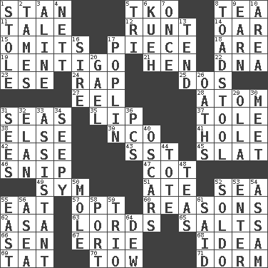 ACROSS 1. Comedian Laurel of Laurel & Hardy 5. Ring climax 8. Beverage made from leaves 11. Falsehood 12. The smallest animal of a litter 14. Rowing implement 15. Leaves out 17. Part 18. "We ___ not amused" (Victoria) 19. Small, flat, pigmented spot on the skin 21. Layer 22. Heredity factor (abbr.) 23. Compass dir. 24. Strike 25. Two (Sp.) 27. Snakelike fish 28. Tiny particle 31. Oceans 35. Mouth edge 37. Lacquered or enameled metalware 38. Otherwise 39. Non-commissioned officer (abbr.) 41. Opening into or through something 42. Comfort 43. Fast jet (abbr.) 45. Narrow board 46. Sever or remove by pinching or nipping 47. Small bed 49. Symbol (abbr.) 51. Had dinner 52. Ocean 55. Ingest 57. Choose 60. Thinks logically 62. White ___ sheet 63. Domineers 65. Table seasonings 66. Elected rep. 67. 4th largest of the Great Lakes 68. The main thing one is thinking about 69. Make lace 70. Pull behind 71. Dormintory (informal) DOWN 1. Took without asking 2. Softens 3. Place in a line 4. Remaining after all deductions 5. Three (prefix) 6. Malaysian steamed pastry 7. At one time in the past 8. Inedible or poisonous agaric 9. Merit 10. Length times width 13. Watch over 16. Title for a man of rank and authority 17. Cotton for raincoats, e.g. 20. Highlander 26. Expletives 29. Rounded earthenware pot or jar 30. Confront 31. Perceives with the eye 32. Liveliness 33. Helper 34. Not well drained, as in land 36. Personal Computers (abbr.) 40. Motion picture awards 44. Haul 48. Afternoon social gatherings 50. Undercover agent 52. Twentieth part of a lira 53. Keyboard key 54. Indian state 55. 90 degrees 56. At sea 58. Sweet dark-red dessert wine 59. Musical group of three 61. Expressed in words 64. Morning condensation