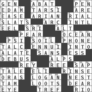 ACROSS 1. Commissioned mil. rank 4. Blind as ____ 8. Animal enclosure 11. Dutch treat 13. Tarsus (plural) 15. "We ___ not amused" (Victoria) 16. Relaxation 17. Believer in; advocate of (suffix) 18. Monetary unit of Yemen 19. Narrow boards 21. Curve 22. International (abbr.) 23. Snakelike fish 24. Indian title of respect (Mr.) 27. Keyboard modifier key 29. Lightbulb-shaped fruit 30. Sea 34. Air pressure measure (abbr.) 36. The visible part of the earth's surface 39. Give a jingle 40. Baby powder 41. World-weariness 43. To the inside or interior of 44. Having winglike extensions 46. Without 47. Curvy letter 48. Alight from a bus 49. High mountains 51. Marina Del _, California 53. To separate or throw off 54. Plant excrement 57. Story 60. Biblical high priest 63. Wash lightly 65. Mouths or openings 66. Utah city north of Ogden 69. Egg locale 70. Scottish cap 71. Plunders 72. Letter starter 73. Sight organ 74. Not kosher 75. _ de Janeiro DOWN 1. Honkers 2. Peak District village in England 3. Relating to the nose 4. "One Day ___ Time" 5. Tavern 6. Operatic vocal solo 7. Russian ruler of old 8. Ache 9. Part of Q.E.F. 10. 1994 drama film starring Jodie Foster 12. Was introduced to 14. South American Indian 18. Actors Guy, Robert Welles, and Clint 20. Compass dir. 25. To erase 26. Removes the wrinkles 28. Chop off 29. Photos 31. Immeasurably long periods of time 32. Pismires 33. Modern: prefix 34. Diluted with white 35. Thick slice 37. _ tizzy (2 wds.) 38. Type of eclipse 40. Small amount or degree 42. Small island 45. Compass dir. 50. For each 52. Shout 54. Scornful expression 55. Slender Brazilian palm 56. Stone: prefix 57. Carry 58. Like ___ of sunshine 59. Unable to walk 61. Spoils 62. Composer Stravinsky 64. Working for oneself (abbr.) 67. Had dinner 68. Science/research agcy.