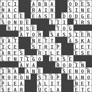 ACROSS 1. One more than ninety 4. Swedish rock group 8. Lyric poems 12. Apple computer (short form) 13. Precipitation 14. Trig term 15. Toward shelter 17. Compass direction 18. Evade 19. Message 21. One more than two 23. Big collection agency 24. Remove soap 26. Coat; cloak 28. Smallest unit of an element 30. More disrespectful 34. Large container 37. Remaining after all deductions 39. "____ silly question..." 40. Frozen water 41. Long narrow piece of something 43. Allow 44. Ancient Greek god of war 46. Cause heat under the collar 47. Compass dir. 48. Small, flat, pigmented spot on the skin 51. Comfort 54. Actress Gardner 55. "The Thinker" sculptor 58. Lyricist Gershwin 61. A saturated hydrocarbon 63. Sir (Sp.) 65. Person of subnormal intelligence 67. Cease 71. Billionth: prefix 72. Entreaty 73. Set down 74. Fish or hair follower 75. Burn superficially 76. Southern CA. univ. 77. And so on (abbr.) DOWN 1. Dec. holiday 2. Bodily heat indicating an inflammation 3. Ancient Celtic tribe of eastern Britain 4. "We ___ not amused" (Victoria) 5. Sound made by sheep 6. Altar cloth linen 7. Against 8. Bear (Spanish) 9. "You Light Up My Life" star Conn 10. Engineer (abbr.) 11. Observes 16. Pulitzer Prize-winning author Ferber 18. "Vaya con ____" 20. Eastern Standard Time (abbr.) 22. Call ___ day 25. Immeasurably long periods of time 27. Girls' org. (abbr.) 29. Paris' subway 30. Vertical member of a panel or frame 31. Small island 32. Makes supply last 33. Assign a rank or rating to 34. Small bottle 35. Measure of real estate 36. Adolescent 38. Three (prefix) 42. Lightbulb-shaped fruit 45. R.R. building 49. _ the terrible 50. Separate the seeds from cotton 52. Mayday 53. Genesis locale 56. Empty; void 57. Music written for nine 58. Naughty children 59. Hero or heavy, e.g. 60. Type of rug 62. He sold his birthright 64. College mil. group 66. Rowing implement 68. Affectionate concern, for short 69. Petroleum 70. Parent Teacher Assoc.