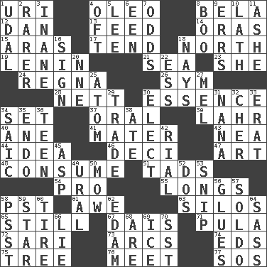 ACROSS 1. RI univ. 4. Margarine 8. Actor Lugosi 12. Daniel's nick name 13. Nourish 14. Mouths or openings 15. Caspian sea tributary 17. Watch over 18. _ pole 19. Soviet premier 1918-24 21. Ocean 23. A female animal or person 24. Canadian anthropologist Darnell 26. Symbol (abbr.) 28. Remaining after all deductions 30. Center 34. Put into a specified state 37. Taken by mouth 39. Cowardly lion portrayer 40. A saturated hydrocarbon 41. Mother 43. Teachers' org. 44. It may be bright or harebrained 46. Tenth: prefix 47. Nonscientific branch of learning 48. Ingest 51. Small boys 54. Adept person 55. Yearns 58. Pacific Standard Time (abbr.) 61. Deep reverence 63. Grain storage towers 65. Not moving 67. Raised platform 71. Monetary unit of Botswana 72. Indian skirt 73. Curves 74. Begley and Asner 75. Woody plant 76. Rendezvous 77. Distress signal DOWN 1. Freehold land 2. More uncommon 3. Lacking in sense or substance 4. Often (poetically) 5. Area sheltered from the wind 6. Car or cant ending 7. Likelihood 8. Surprise greeting 9. Blunders 10. Thin strip of wood or metal 11. American tennis player Robert 16. Signal 18. Negative votes 20. Compass dir. 22. Double-curved letter 25. Tiny particle 27. Cartoonist voice _ Blanc 29. Swap 30. Choose 31. Grandmother 32. "Mermaids" star 33. Part of Q.E.F. 34. Ketch in the Levant 35. Inside; within (prefix) 36. Adolescent 38. Had dinner 42. Monetary unit of Yemen 45. Cleo's killer 49. Mountain range 50. Cut the grass 52. Two (Sp.) 53. Sever or remove by pinching or nipping 56. Cements 57. Twentieth part of a lira 58. Inconspicuous attention getter 59. Play the lead 60. Become fatigued 62. Dutch treat 64. Backtalk 66. Falsehood 68. "We ___ not amused" (Victoria) 69. Frozen water 70. Fast jet (abbr.)