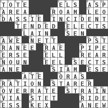 ACROSS 1. Lug 5. Raised railways 8. Viper 11. Type of rug 12. Wander 13. Lion 14. Hyrax 17. Event 19. Watched over 21. Opts 22. (Had) reclined 23. Elected rep. 24. Deep reverence 27. Remaining after all deductions 29. Pacific Standard Time (abbr.) 32. Indian princess (variant) 34. Actress Charlotte 36. Corncob 37. Celtic language 38. Pipe bend 39. Buttocks 40. Part of speech 41. Snakelike fish 42. Religious groups 43. One (Scot) 44. Thailand, formerly 46. Compass dir. 47. Had dinner 50. Mouths or openings 52. Food allowance for one day 55. A viewer who gazes fixedly 57. Make much ado about nothing 59. Put through a sieve 62. By way of 63. Proofreading order 64. Travel on an animal 65. Double-curved letter 66. A weed 67. Afresh DOWN 1. Bit 2. Mouth or opening 3. Trial 4. Artist's stand 5. Age 6. Shoestrings 7. Grin 8. Actor Baldwin 9. Transmitted 10. Plant holders 12. To free from 15. Silly 16. Singer Brickell 18. Lair 20. Main course 24. Sports stadium 25. Make _____ (do battle with) 26. Follow as a consequence or result 28. Lies 29. Component 30. Arguments over trivial matters 31. Laconic 33. Car or cant ending 35. American author Paul (1891-1958) 36. Before (prefix) 42. Don Adams' spy role 45. Ancient river in northeast Turkey 47. Wind 48. Cod relative 49. Maternal 51. Father Junipero _ 52. Be footloose 53. Deliberation 54. Beverages made from leaves 55. Put into a specified state 56. Precipitation 58. John Ritter's dad 60. Binary compound 61. ___ Haven, CT