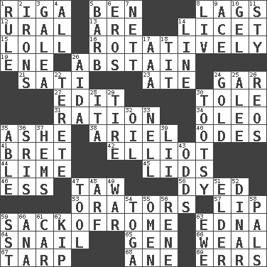 ACROSS 1. Capital of Latvia 5. Benjamin's nick name 8. Falls behind 12. Mountain range 13. "We ___ not amused" (Victoria) 14. It is permitted: Lat. 15. Hang loosely or laxly 16. Producing rotation 19. Compass dir. 20. Refrain by choice 21. Suttee (variant) 23. Had dinner 24. Slender fish 27. Prepare for publication 30. Lacquered or enameled metalware 31. Food allowance for one day 34. Margarine 35. American tennis player Robert 38. Satellite of Uranus 40. Lyric poems 41. Cy Young winner Saberhagen 42. American author Paul (1891-1958) 44. Welles in "The Third Man" 45. Hats (slang) 46. Double-curved letter 47. The 23rd letter of the Hebrew alphabet 50. Colored 53. Speakers 57. Mouth edge 59. Italian handbag shop? 63. Pulitzer Prize-winning author Ferber 64. Slow-paced one 65. Commissioned military rank (abbr.) 66. Welt 67. Canvas cover 68. A saturated hydrocarbon 69. Blunders DOWN 1. Court order 2. Metal shackles 3. An organ shaped like a helmet 4. 100% 5. Sharp remark 6. Greek god of love 7. Remaining after all deductions 8. 54 in ancient Rome 9. Adept person 10. Set 11. Filthy place 14. Actor's bit 17. American Automobile Association (abbr.) 18. Teat (slang) 20. Opera by Verdi 22. Cylindrical with tapered ends 24. Precious metal 25. Toward shelter 26. Vintage cars 28. Call ___ day 29. Hoop that covers a wheel 30. Tootsie (variant) 32. Petroleum 33. 1994 drama film starring Jodie Foster 35. Competent 36. Indian titles of respect 37. Folds over and sews together 39. Cards in a Roman deck? 43. Likelihood 47. Implement 48. Sandy's bark 49. Armed conflict 51. A person who is older than you are 52. Middle Eastern gold or silver currency 54. Ancient Roman robe 55. Sign of things to come 56. French philosopher Descartes 58. Friends 59. Fast jet (abbr.) 60. Santa ___, CA 61. Automobile 62. Monetary unit of Laos 63. She-sheep