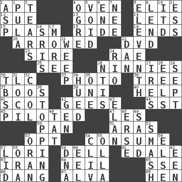 ACROSS 1. Fitting 4. Baking chamber 8. Writer Wiesel 12. Institute legal proceedings 13. Went 14. Allows 15. Suffix with ecto or cyto 18. Travel on an animal 19. Extremities 20. Moved like an arrow 22. Movie disc 23. Title for a man of rank and authority 24. Actress Charlotte 25. Perceive with the eye 26. Simpletons 30. Affectionate concern, for short 33. Picture 36. Relationship diagram 37. Scornful sounds 39. University (slang) 40. Assist 41. Highlander 42. Honkers 44. Fast jet (abbr.) 45. Manned the helm 47. French article 50. Baking dish 51. Ancient river in northeast Turkey 53. Choose 54. Ingest 57. Australian parrot (variant) 59. Small valley 61. Peak District village in England 63. SW Asia republic 64. Famous astronaut Armstrong 65. Compass dir. 66. Mild oath, euphamism for damn 67. Inventor's middle name 68. Layer DOWN 1. Viper 2. Monetary unit of Botswana 3. Rends 4. Legendary monster 5. Lacking any legal or binding force 6. Conclusion 7. Born 8. Veterans Day date 9. Grant temporary use of 10. It would 11. Curvy letter 16. Indian titles of respect 17. Greater amount 21. Shed a tear 22. Daniel's nick name 24. _ de Janeiro 26. Nuclear Threat Initiatives 27. Angers 28. Snakelike fish 29. Back-to-school mo. 30. Cook's measure (abbr.) 31. Locales 32. Calm and collected 34. Became colored 35. Single 38. Closing up, plugging up 42. Commissioned mil. rank 43. Liveliness 46. Make lace 48. Celtic language 49. Saudi Arabian king (1953-1964) 52. Box-office sellout 53. NW Algerian seaport 54. 154 in Roman numerals 55. Water jar 56. Otherwise 57. Hat (slang) 58. Mouth or opening 59. Heredity factor (abbr.) 60. Snakelike fish 62. Car or cant ending