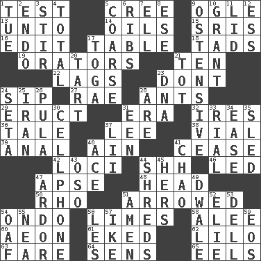 ACROSS 1. Trial 5. Algonquian 9. Stare 13. To (old English) 14. Petroleums 15. Indian titles of respect 16. Prepare for publication 17. Eating place 18. Small boys 19. Speakers 21. "___ Little Indians" 22. Fails to keep up a pace 23. Do not 24. Small drink 27. Actress Charlotte 28. Pismires 29. Spew [out] 31. Period 32. Angers 36. Story 37. Area sheltered from the wind 38. Small bottle 39. Of or related to the anus 40. The 18th letter of the Arabic alphabet 41. Desist 42. Event scenes 44. Quiet! 46. Directed 47. Domed church section 48. Froth on beer 50. 17th letter of the Greek alphabet 51. Moved like an arrow 54. Southwest Nigerian state 56. Citrus fruits 58. Toward shelter 60. Period of immesurable duration 61. Supplemented with great effort 62. _ and Stitch 63. Conductor's collection 64. Elected reps. 65. Snakelike fish DOWN 1. Third day of the wk. 2. Inside; within (prefix) 3. Tumult 4. "_____ Recall" 5. Rough 6. Chest bones 7. Pipe bend 8. Compass dir. 9. Clearly or manifestly demonstrative 10. Let have 11. Flaplike covering 12. Double-curved letter 17. Ancient Roman robe 20. Small pie 21. Small child 23. Heredity factor (abbr.) 24. Stalk of a moss capsule 25. SW Asia republic 26. Monetary unit of Botswana 28. "We ___ not amused" (Victoria) 30. Portable communications device 31. Car or cant ending 33. Monetary unit of Yemen 34. Relaxation 35. Downhill vehicle 37. Cards in a Roman deck? 40. Adept person 41. US Secretary of Labor Elaine L. _ 43. Bear (Spanish) 44. Tears up 45. Possessive pronoun 47. Zeal 49. A sleeping potion; an opiate (poet.) 51. So be it 52. Writer Wiesel 53. Small valley 54. Clumsy lout 55. Teachers' org. 56. French article 57. Mamie's husband 59. Greek goddess of the dawn