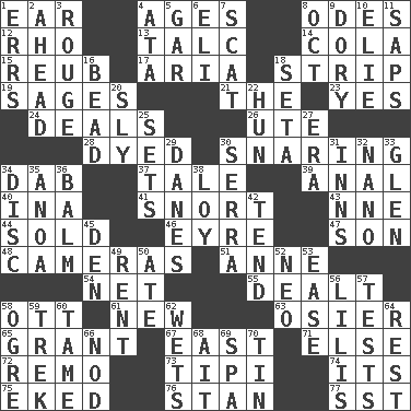 ACROSS 1. Ewer handle 4. Eras 8. Lyric poems 12. 17th letter of the Greek alphabet 13. Baby powder 14. Root beer relative 15. Reuben's nickname 17. Roberta Peters solo 18. Remove all contents or possession from 19. Gurus 21. Definite Article 23. It is so 24. Allots cards 26. Shoshoni 28. Colored 30. Catching in a trap 34. Small moist lump or mass 37. Falsehood 39. Of or related to the anus 40. _ tizzy (2 wds.) 41. Derisive sound 43. Compass dir. 44. Disposed of to a purchaser 46. Jane of fiction 47. Manchild 48. Devices for capturing images 51. Queen of England 1702-14 54. Fish or hair follower 55. Started a card game 58. Baseball player Mel 61. ___ Haven, CT 63. Flexible twig of a willow tree 65. Let have 67. Compass direction 71. Otherwise 72. San ____ (Riviera town) 73. Native american tent (variation) 74. It is 75. Made supply last 76. Comedian Laurel of Laurel & Hardy 77. Fast jet (abbr.) DOWN 1. Blunders 2. Having the leading position 3. Makeup applied to the cheeks 4. _ moment's notice (2 wds.) 5. Slender fish 6. Biblical high priest 7. Jazz singing style 8. Sep. follower 9. Small, narrow, flatbottom fishing boat 10. Writer Wiesel 11. Plant excrements 16. Necklace unit 18. Stalk of a moss capsule 20. Roguish 22. Attila the _ 25. Arranges properly for use 27. Period 29. Natives or inhabitants of Denmark 30. Father Junipero _ 31. Taverns 32. Billionth: prefix 33. Small, secluded valley 34. Compact _ 35. Small Philippine buffalo 36. Lip ointment 38. Myrna of the movies 42. Be inclined (to) 45. Lair 49. Monthly bill 50. Had dinner 52. Modern: prefix 53. Comfort 56. Ms. Damita and namesakes 57. Trials 58. Legendary monster 59. Long journey 60. Not wild 62. Moistens 64. State of inaction 66. Lower and raise head in agreement 68. Small island 69. Health resort 70. Metal container