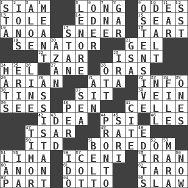 ACROSS 1. Thailand, formerly 5. Yearn 9. Lyric poems 13. Lacquered or enameled metalware 14. Pulitzer Prize-winning author Ferber 15. Oceans 16. Small Philippine buffalo 17. Contemptuous expression 18. Small pie 19. Legislator 21. Set 22. Russian ruler 23. Is not 24. Cartoonist voice _ Blanc 27. A saturated hydrocarbon 28. Mouths or openings 29. Believer in; advocate of (suffix) 31. _ moment's notice (2 wds.) 32. Information 36. Airtight sealed metal containers 37. Be seated 38. Distinctive style or manner 39. Perceives with the eye 40. Writing instrument 41. Cell (Danish) 42. The main thing one is thinking about 44. Air pressure measure (abbr.) 46. French article 47. Russian ruler of old 48. Assign a rank or rating to 50. It would 51. Mood resulting from idleness 54. Pale green bean 56. Ancient Celtic tribe of eastern Britain 58. SW Asia republic 60. Soon (poet.) 61. Stupid person 62. Pacific island yam 63. Role in a play 64. Von Bismarck 65. Cole _ (cabbage dish) DOWN 1. R.R. building 2. Charged atoms 3. _ vera 4. Intended 5. Poe poem 6. River in Europe 7. Compass dir. 8. Slender fish 9. Clearly or manifestly demonstrative 10. Started a card game 11. Hearing organ 12. Fast jet (abbr.) 17. Comedian Laurel of Laurel & Hardy 20. Muslim summons to prayer 21. Girls' org. (abbr.) 23. Lyricist Gershwin 24. Floor coverings 25. 4th largest of the Great Lakes 26. Actor's bit 28. Baseball player Mel 30. Helper 31. The 18th letter of the Arabic alphabet 33. 1994 drama film starring Jodie Foster 34. Do some clerical work 35. Singles 37. Ocean 40. For each 41. Quote 43. June honoree 44. Right away 45. Indian skirt 47. Southeast Indonesia island 49. Prepares for publication 51. Waist strap 52. Spoken 53. Hindu Mythology: god of death 54. Infant locale 55. _ tizzy (2 wds.) 56. Wedding promise 57. Small bed 59. Immediately