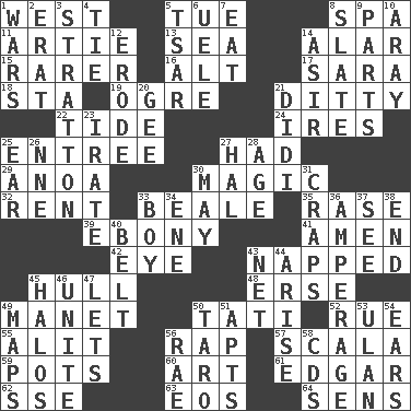 ACROSS 1. Compass direction 5. Third day of the wk. 8. Health resort 11. Nick name for Arthur 13. Ocean 14. Having or resembling wings 15. More valued for its uncommonness 16. The first octave above the treble staff 17. "Two Mules for Sister ____" 18. R.R. building 19. Legendary monster 21. Short, simple song 22. Periodic rise and fall of the sea level 24. Angers 25. Main course 27. Possessed 29. Small Philippine buffalo 30. Mysterious quality of enchantment 32. Monthly bill 33. Calif. Air Force Base 35. To erase 39. Black 41. So be it 42. Sight organ 43. Slept 45. Frame or body of a ship 48. Celtic language 49. French painter Edouard 50. Jacques of French films 52. Regret 55. Came down and settled, as after flight 56. Reproach for some lapse or misdeed 57. Any of the three canals of the cochlea 59. Cooking vessels 60. Nonscientific branch of learning 61. _ Allan Poe 62. Compass dir. 63. Greek goddess of the dawn 64. Elected reps. DOWN 1. Armed conflicts 2. Part of Q.E.F. 3. Ski resort town in Vermont 4. Standoff 5. Russian ruler of old 6. Ubangi River tributary 7. Ingest 8. Schedule 9. Components 10. Like ___ of sunshine 12. Eat (away) 14. SW Saudi Arabia district 20. Turn to the right 21. "You Light Up My Life" star Conn 23. Feeling or showing extreme anger 25. Hearing organ 26. Compass dir. 27. Actor Linden 28. Ripen 30. Can I? 31. Dice game 33. Male child 34. Compass dir. 36. Electrical Measurement 37. Perceive with the eye 38. Conclusion 40. Waist strap 43. Fish or hair follower 44. Get up 45. Saint headwear 46. Join together 47. Allows 49. Atlas contents 50. Edible starchy tuberous root 51. Flats, for short 53. Uhlan (variant) 54. Hearing organs 56. Actress Charlotte 58. Music discs