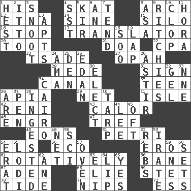 ACROSS 1. Part of HMS, perhaps 4. Three-handed card game 8. Bowlike part 12. Inactive volcano in Sicily 14. Trig term 15. Grain storage tower 16. Obstruct or block passage 17. Interpreter 20. A blast of a horn 21. ___ good deed 22. Numbers guy (abbr.) 23. Sadhe (variant) 27. Brightly colored fish 29. Ancient Persian 31. Public display of a written message 34. Lessep's creation 35. Adolescent 36. Capital of Western Samoa 39. Was introduced to 41. Capri or Wight 42. Painter Guido (1575-1642) 43. Bodily heat indicating an inflammation 46. Engineer (abbr.) 47. Not kosher 48. Immeasurably long periods of time 51. _ dish (used to culture cells) 54. Raised railways 56. Environmental prefix 58. Greek god of love 61. Producing rotation 66. Object of repulsion 67. Arabian gulf 68. Writer Wiesel 69. Proofreading order 70. Periodic rise and fall of the sea level 71. Pinches, bites 72. Curvy letter DOWN 1. Command 2. "Tell ____ the Marines!" 3. Snout, nose 4. Fast jet (abbr.) 5. Apertif with cassis 6. Santa ___, CA 7. Be inclined (to) 8. White ___ sheet 9. Actors Guy, Robert Welles, and Clint 10. Hoof sound 11. Israeli folk dance 13. Flats, for short 18. "Barney Miller" actor Jack 19. Pet locale 24. Housemaid (var.) 25. Lair 26. Dutch treat 28. Moving about 30. Choose 32. Set 33. Compass dir. 34. Capital of Egypt 36. "We ___ not amused" (Victoria) 37. Fenced enclosure 38. Consumed 40. Canvas cover 44. Area sheltered from the wind 45. Often (poetically) 49. Fish or hair follower 50. _-fi 52. Confederate soldiers (slang) 53. Feeling or showing extreme anger 54. Part of Q.E.F. 55. Farming town in central California 57. Baking chamber 59. Singles 60. Puts into a specified state 62. A saturated hydrocarbon 63. Biblical high priest 64. Mouth edge 65. Consenting reply