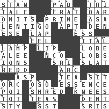 ACROSS 1. Comedian Laurel of Laurel & Hardy 5. Groovy apt. 8. Three (prefix) 11. Lie 12. Part of Q.E.F. 14. Boat paddle 15. Leaves out 17. A-one 18. White ___ sheet 19. Small, flat, pigmented spot on the skin 21. Fitting 22. Lair 23. Compass dir. 24. Infant locale 25. Curvy letter 27. Snakelike fish 28. Slanted text style (abbr.) 31. Desk light 35. Mouth edge 37. Ear part 38. Toward shelter 39. Non-commissioned officer (abbr.) 41. Tennis shots 42. Charged atoms 43. Indian title of respect (Mr.) 45. Narrow board 46. Make new 47. Curve 49. Viper 51. Beverage made from leaves 52. Be seated 55. The grampus (Milton) 57. Bear (Spanish) 60. Core 62. Luau course 63. Fragment 65. Leg joints 66. Small child 67. Beverages made from leaves 68. Scratch 69. Filthy place 70. Fast jet (abbr.) 71. Indian titles of respect DOWN 1. Fur scarf 2. Makes less strong or intense 3. Place in a line 4. Remaining after all deductions 5. For each 6. Roberta Peters solo 7. Moist 8. Inedible or poisonous agaric 9. Raze (variant) 10. SW Asia republic 13. False hair 16. Filth; sediment 17. Cotton for raincoats, e.g. 20. Highlander 26. Beverly of Met fame 29. Swedish rock group 30. For fear that 31. Den 32. Medicinal plant 33. Ananias' fault 34. Mexican monetary units 36. Personal Computers (abbr.) 40. Spoke pompously 44. Angers 48. Keg 50. Mail 52. Contemptuous expression 53. Ancient Celtic tribe of eastern Britain 54. Trials 55. Elects 56. Carrot, for example 58. "______ My Girl" (Turtles hit) 59. Mouths or openings 61. Extremities 64. Eastern Standard Time (abbr.)