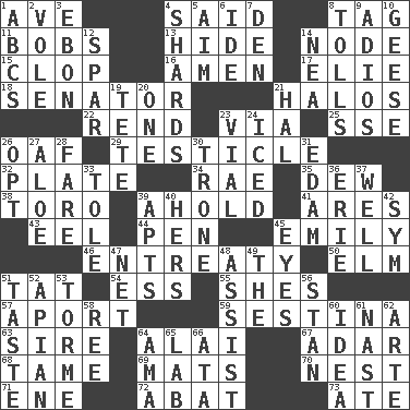 ACROSS 1. "___ Maria" 4. Alleged 8. Label 11. Moves up and down 13. Flintstone garb 14. Thickened enlargement 15. Hoof sound 16. So be it 17. Writer Wiesel 18. Elected representative 21. Saint headwear 22. Tear apart 23. By way of 25. Compass dir. 26. Clumsy lout 29. A testis 32. Food holder 34. Actress Charlotte 35. Morning condensation 38. "Corrida" creature 39. Hold, grip (Informal) 41. Ancient Greek god of war 43. Snakelike fish 44. Animal enclosure 45. Poet Dickinson 46. Plea 50. Shade tree 51. Make lace 54. Double-curved letter 55. "______ My Girl" (Turtles hit) 57. To the left, to Queeg 59. French poetic form 63. Male parent of an animal 64. Jai ____ 67. The sixth month of the Jewish calendar 68. Not wild 69. Floor coverings 70. A home for chicks 71. Compass dir. 72. Blind as ____ 73. Had dinner DOWN 1. Lettered men learn these first 2. Short-tailed, large-bodied rat 3. Inky black, to poets 4. Pottery fragments 5. Direct toward a target or goal 6. Binary compound 7. Lair 8. For Whom the Bell _____ 9. Goodbye (Sp.) 10. Honkers 12. Practice fight 14. Teachers' org. 19. Wig 20. Single 21. Actor Linden 23. Small bottle 24. On the rocks 26. Choose 27. _ vera 28. Conductor's collection 30. Marketplace scale 31. Dutch treat 33. Lacquered or enameled metalware 36. One of the Great Lakes 37. Not ill 39. Flats, for short 40. Possessive pronoun 42. Symbol (abbr.) 45. Snake ____ (dice throw) 47. Fish or hair follower 48. Help 49. Definite Article 51. Clothes sense 52. Bee-related 53. Singer Mel 56. Comedian Laurel of Laurel & Hardy 58. Portuguese money of account (variant) 60. It may be bright or harebrained 61. Political cartoonist Thomas 62. Johnson of "Laugh-In" 64. Housemaid (var.) 65. Experiment locale 66. _ moment's notice (2 wds.)