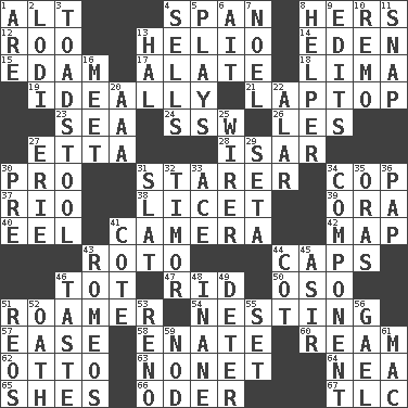 ACROSS 1. Keyboard modifier key 4. Connect, as a bridge 8. Possessive pronoun 12. Friend of Pooh 13. Sun: prefix 14. Paradise 15. Dutch treat 17. Having winglike extensions 18. Pale green bean 19. Under perfect conditions 21. Portable computer 23. Ocean 24. Compass dir. 26. French article 27. Singer James 28. Austrian river, tributary to the Danube 30. Adept person 31. A viewer who gazes fixedly 34. Police officer (slang) 37. _ de Janeiro 38. It is permitted: Lat. 39. Mouth or opening 40. Snakelike fish 41. Device for capturing images 42. Atlas unit 43. Printing process, for short 44. Smile enhancers 46. Small child 47. To free from 50. Bear (Spanish) 51. Nomad 54. Snuggling 57. Comfort 58. Related on the mother's side 60. 480, 500 or 516 sheets of paper 62. Von Bismarck 63. Music written for nine 64. Teachers' org. 65. "______ My Girl" (Turtles hit) 66. River in Europe 67. Affectionate concern, for short DOWN 1. "We ___ not amused" (Victoria) 2. Farming town in central California 3. Inedible or poisonous agaric 4. Makes a sale 5. Romps 6. Small island 7. Christmas carol 8. Assistant 9. Proofreads 10. San ____ (Riviera town) 11. Fastener 13. Actor Linden 16. Confront 20. Auto club (abbr.) 22. Having or resembling wings 25. One who wires 27. 4th largest of the Great Lakes 29. Stalk of a moss capsule 30. Before (prefix) 31. Narrow board 32. The easternmost of the Lesser Sundas 33. Adept person 34. Part 35. Mouths or openings 36. Infant food 41. ____ d'Azur (French Riviera) 43. Lover boys 44. Small bed 45. SW Saudi Arabia district 46. Clothes sense 48. Lacking in sense or substance 49. Prevent from occurring 51. Vintage cars 52. Pledge 53. Western Nevada city 55. Put into a specified state 56. Highlander 59. Dreamland 61. Apple computer (short form)