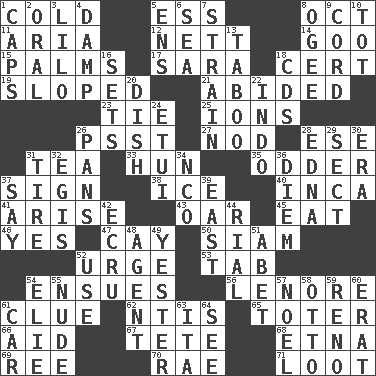 ACROSS 1. Having a low temperature 5. Double-curved letter 8. Sep. follower 11. Operatic vocal solo 12. Remaining after all deductions 14. Thick or sticky substance 15. Insides of hands 17. "Two Mules for Sister ____" 18. Certainty 19. Slanted 21. Stayed 23. Standoff 25. Charged particles 26. Inconspicuous attention getter 27. Lower and raise head in agreement 28. Compass dir. 31. Beverage made from leaves 33. Attila the _ 35. More peculiar 37. Public display of a written message 38. Frozen water 40. South American Indian 41. Get up 43. Boat paddle 45. Ingest 46. Consenting reply 47. Island 50. Thailand, formerly 52. Goad 53. Keyboard key 54. Takes place subsequently 56. Poe poem 61. A slight indication 62. Nuclear Threat Initiatives 65. Carrier 66. Assist 67. Wig 68. Inactive volcano in Sicily 69. To sift 70. Actress Charlotte 71. Spoils DOWN 1. Smile enhancers 2. Taken by mouth 3. _ and Stitch 4. Moist 5. Followers of ems 6. Ocean 7. Put through a sieve 8. Double curve, resembling the letter S 9. Drawstring 10. Small child 13. Off limits 16. Arranges properly for use 18. Music discs 20. Food container 22. Southeast Asian peninsula 24. Needle case 26. Zero-star reviews 28. Pulitzer Prize-winning author Ferber 29. Religious group 30. Epoch 31. Become fatigued 32. Armor plate that protects the chest 34. Non-commissioned officer (abbr.) 36. South Vietnam president (1954) 37. Declare 39. Compass direction 42. Shade of tan 44. Monetary unit of Yemen 48. Rep 49. Next before 51. Collude with 52. Purpose 54. Writer Wiesel 55. Unadorned 57. Christmas carol 58. Von Bismarck 59. Former U.S. Attorney General Janet 60. Part of Q.E.F. 61. Automobile 63. Call ___ day 64. Observe