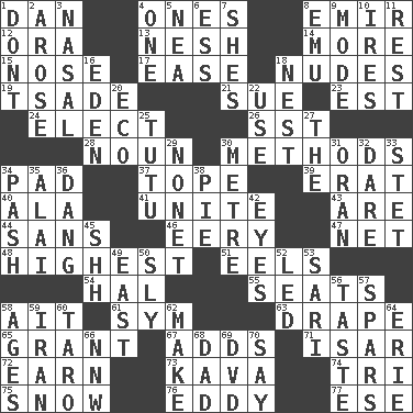 ACROSS 1. One of the 12 tribes of Israel 4. Washington bills 8. Arab leader 12. Mouth or opening 13. Delicate 14. Greater amount 15. Olfactory organ 17. Comfort 18. Unclothed pictures 19. Sadhe (variant) 21. Take to court 23. Eastern Standard Time (abbr.) 24. Choose 26. Fast jet (abbr.) 28. Part of speech 30. Modes 34. Writing tablet 37. Drink excessively 39. Part of Q.E.F. 40. Wing 41. Join together 43. "We ___ not amused" (Victoria) 44. Without 46. Suggestive of the supernatural 47. Fish or hair follower 48. Having the greatest elevation 51. Snakelike fish 54. Actor Linden 55. Theater features 58. Small island 61. Symbol (abbr.) 63. Window treatment 65. Monetary aid 67. Does sums 71. Austrian river, tributary to the Danube 72. Merit 73. Polynesian shrub of the pepper family 74. Three (prefix) 75. Overwhelm 76. Whirlpool 77. Compass dir. DOWN 1. Do not 2. Came up 3. Rhinal 4. Single 5. Teachers' org. 6. Curvy letter 7. "______ My Girl" (Turtles hit) 8. Australian flightless bird 9. Method 10. Angers 11. State of inaction 16. Paradise 18. Egg locale 20. Environmental prefix 22. Purpose 25. Ballerina skirt 27. Definite Article 29. Music written for nine 30. Distance measurement (Brit.) 31. Northwest Algerian city 32. Have the gumption 33. Proofreading order 34. Romantic infatuation 35. Mountain range southwest of Kyrgyzstan 36. Mild oath, euphamism for damn 38. Sliced dessert 42. Snake ____ (dice throw) 45. Quiet! 49. 90 degrees 50. Cunning 52. Directed 53. Indian skirt 56. Clothes sense 57. Practice fights 58. Ripens 59. SW Asia republic 60. Edible starchy tuberous root 62. Create 64. 4th largest of the Great Lakes 66. Compass dir. 68. June honoree 69. Movie disc 70. Declare