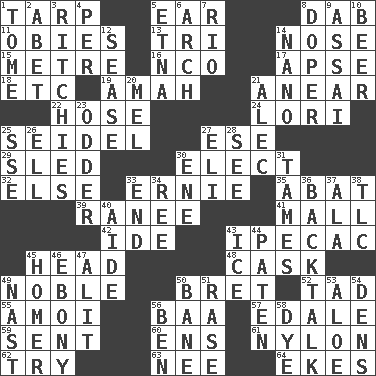 ACROSS 1. Canvas cover 5. Ewer handle 8. Apply (a substance) by light strokes 11. Off-Broadway awards 13. Three (prefix) 14. Olfactory organ 15. Distance measurement (Brit.) 16. Non-commissioned officer (abbr.) 17. Domed church section 18. And so on (abbr.) 19. Nanny 21. Approach 22. Stockings 24. Australian parrot (variant) 25. A glass for beer 27. Compass dir. 29. Downhill vehicle 30. Voters do this 32. Otherwise 33. Bert's buddy 35. Blind as ____ 39. The wife of a rajah (variant) 41. Shopping center 42. Binary compound 43. Medicinal drug used to evoke vomiting 45. Froth on beer 48. Keg 49. Having high moral qualities 50. Cy Young winner Saberhagen 52. Bit 55. Mine, in Marseilles 56. Sound made by sheep 57. Peak District village in England 59. Posted 60. Followers of ems 61. High-strength synthetic material 62. Attempt 63. Born 64. Makes supply last DOWN 1. Heavy book 2. Collude with 3. Actors Guy, Robert Welles, and Clint 4. For each 5. Inactive volcano in Sicily 6. Bowlike part 7. _ de Janeiro 8. Drug addict 9. Slender Brazilian palm 10. Fermented drink made from hops 12. Gospel singer Marvin 14. Billionth: prefix 20. Cartoonist voice _ Blanc 21. Actor Baldwin 23. More peculiar 25. Compass dir. 26. Pipe bend 27. Biblical high priest 28. Perceive with the eye 30. Compass dir. 31. Corrects by punishment or discipline 33. Conclusion 34. To separate or throw off 36. Sass 37. According to 38. Affectionate concern, for short 40. Assistant 43. Frozen water 44. Eucharist need 45. Homing pigeon 46. Black 47. Came down and settled, as after flight 49. Political cartoonist Thomas 50. Object of repulsion 51. Raze (variant) 53. Medicinal plant 54. Lairs 56. Benjamin's nick name 58. Color