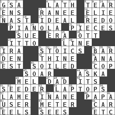 ACROSS 1. Girls' org. (abbr.) 4. Thin strip of wood or metal 8. Pull apart 12. Followers of ems 13. Indian princess (variant) 14. Writer Wiesel 15. Political cartoonist Thomas 17. Standard of perfection 18. Do over again 19. Player piano 21. Parts 23. Take to court 24. Period 26. Baseball player Mel 27. "Tell ____ the Marines!" 28. Actor's bit 30. Retirement account (abbr.) 31. Unemotional ones 34. Long, evenly shaped piece 37. Lair 38. One or ones belonging to thee 39. Santa ___, CA 40. Eastern Standard Time (abbr.) 41. Dirtied 42. Police officer (slang) 43. Fly high 44. "____ silly question..." 46. Cartoonist voice _ Blanc 47. June honoree 50. It is 51. Sowing specialist 54. Portable computers 57. Unable to walk 58. Empty; void 60. Dad 62. One who makes use of a thing 63. Distance measurement 64. 4-wheeled motor vehicle 65. Snakelike fish 66. Perceives with the eye 67. And so on (abbr.) DOWN 1. Commissioned mil. rank 2. Fastener 3. Aide 4. Dipping utensil 5. Approach 6. Afternoon social gathering 7. Assist 8. Cylindrical with tapered ends 9. Voters do this 10. Helper 11. Vintage cars 13. _ de Janeiro 16. Drawn tight 20. Modern: prefix 22. Charged particles 25. Place in a line 27. Angers 29. On the rocks 30. Binary compound 31. Portico 32. One of three equal parts 33. Lubricate 34. Keyboard key 35. Small Philippine buffalo 36. Reproach for some lapse or misdeed 41. Not divided or shared with others 43. Spring feasts 44. Small island 45. Obstruct or block passage 46. Klaipeda city 48. Having winglike extensions 49. Natives or inhabitants of Denmark 51. Turn sharply 52. Relaxation 53. Basketball hoops 55. For each 56. Argument over a trivial matter 59. Born 61. Curve