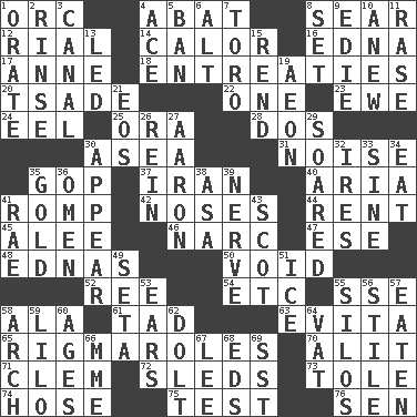 ACROSS 1. The grampus (Milton) 4. Blind as ____ 8. Shrivel 12. Monetary unit of Yemen 14. Bodily heat indicating an inflammation 16. Pulitzer Prize-winning author Ferber 17. Singer Murray 18. Pleas 20. Sadhe (variant) 22. Single 23. She-sheep 24. Snakelike fish 25. Mouth or opening 28. Two (Sp.) 30. Toward the sea 31. Annoying sound 35. Grand Old Party 37. SW Asia republic 40. Operatic vocal solo 41. Play 42. Olfactory organs 44. Monthly bill 45. Toward shelter 46. Drug cop 47. Compass dir. 48. Ferber et al. 50. Null 52. Portuguese money of account (variant) 54. And so on (abbr.) 55. Compass dir. 58. Chicken ___ king 61. Small boy 63. Webber/Rice musical 65. Frustrating wastes of time 70. Set down 71. To starve (Brit.) 72. Bobsleighs 73. Lacquered or enameled metalware 74. Flexible conduit 75. Trial 76. Elected rep. DOWN 1. Declaim 2. Wash lightly 3. Lessep's creation 4. Adept person 5. Bar 6. The first octave above the treble staff 7. "Corrida" creature 8. Arrange properly for use 9. Singer Brickell 10. Afresh 11. To erase 13. Directed 15. Tear apart 19. Age 21. Greek goddess of the dawn 26. It's straight from the horse's mouth 27. Composer Copland 29. Flew 30. Become visible 32. Angers 33. Trig term 34. Consume 35. Gilt 36. Sign of something about to happen 38. White ___ sheet 39. Boldness 41. Actress Charlotte 43. Native of Scotland 49. Bristle 51. Frozen water 53. Hearing organs 55. Grain storage towers 56. Vertical member of a panel or frame 57. Eroded 58. Bowlike part 59. _ and Stitch 60. Ripens 62. Dunce 64. Large container 66. Madame (abbr.) 67. Area sheltered from the wind 68. Begley and Asner 69. Fast jet (abbr.)