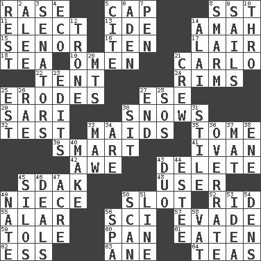ACROSS 1. To erase 5. Head covering 8. Fast jet (abbr.) 11. Choose 13. Binary compound 14. Wet nurse 15. Sir (Sp.) 16. "___ Little Indians" 17. Den 18. Beverage made from leaves 19. Sign of something about to happen 21. Monte _, Las Vegas Hotel/Casino 22. Portable shelter 24. Basketball hoops 25. Eats (away) 27. Compass dir. 29. Indian skirt 30. Overwhelms 32. Trial 33. Unmarried girls 35. Heavy book 39. Don Adams' spy role 41. _ the terrible 42. Deep reverence 43. Erase 45. Neighbor of Neb. 48. One who makes use of a thing 49. Sibling's daughter 50. Groove 52. To free from 55. Having or resembling wings 56. _-fi 57. Dodge 59. Lacquered or enameled metalware 60. Baking dish 61. Ingested 62. Double-curved letter 63. A saturated hydrocarbon 64. Afternoon social gatherings DOWN 1. Relief 2. Toward shelter 3. Legislators 4. Environmental prefix 5. Quote 6. Arabian gulf 7. Fenced enclosure 8. Excessive but superficial compliments 9. Travel by water 10. Through, poetically 12. Marketplace scale 14. Jai ____ 20. Mountains (abbr.) 21. Ship's personnel 23. Prepares for publication 25. Eastern Standard Time (abbr.) 26. Actress Charlotte 27. Conclude 28. Distress signal 30. Be seated 31. Vertical member of a panel or frame 33. Opening into something insatiable 34. "We ___ not amused" (Victoria) 36. Make much ado about nothing 37. Floor protector 38. Compass dir. 40. Create 43. Superhero pair 44. First name in cosmetics 45. Grain storage towers 46. Allots cards 47. Land measure 49. Nathan's nickname 50. Skim 51. Actor's bit 53. It may be bright or harebrained 54. Hiding places for outlaws 56. Health resort 58. Large container