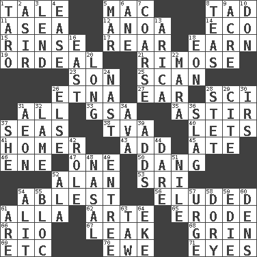 ACROSS 1. Story 5. Big _ 8. Small amount or degree 11. At sea 12. Small Philippine buffalo 14. Environmental prefix 15. Remove soap 17. Posterior 18. Merit 19. Severe or trying experience 21. Full of chinks, cracks, or crevices 23. Boy, to dad 25. Skim 26. Inactive volcano in Sicily 27. Hearing organ 28. _-fi 31. 100% 33. Girls' org. (abbr.) 35. Being in motion 37. Oceans 38. Federal power corp. 40. Allows 41. Baseball hit which scores a run 43. Find the sum of 45. Had dinner 46. Compass dir. 47. Single 50. Mild oath, euphamism for damn 52. Actor Alda or Thicke 53. Indian title of respect (Mr.) 54. Most capable 56. Dodged 61. Silent film actress Nazimova 62. Johnson of "Laugh-In" 65. Wear away 66. _ de Janeiro 67. Path through which fluid escapes 68. Smile widely 69. And so on (abbr.) 70. She-sheep 71. Sight organs DOWN 1. Pacific island yam 2. SW Saudi Arabia district 3. Grant temporary use of 4. Relaxation 5. Spoil 6. One (Scot) 7. Rough 8. Afternoon social gatherings 9. 1/640 square mile 10. Spanish title 13. N. Chile seaport 16. Compass direction 18. Age 20. Yearn 22. Hindu Mythology: god of death 24. Political cartoonist Thomas 26. Otherwise 28. Proofreading order 29. Quote 30. Big collection agency 31. A really long time 32. Unable to walk 34. Actress Gardner 36. Volcanic refuse 37. A female animal or person 39. Sums up 42. Hero or heavy, e.g. 44. Have the gumption 48. Rhinal 49. Main course 51. Mediterranean tributary 52. Insect wing 54. Came down and settled, as after flight 55. Group of countries in special alliance 57. Goad 58. Dinghy 59. Singer Brickell 60. Hiding places for outlaws 61. "We ___ not amused" (Victoria) 63. The 23rd letter of the Hebrew alphabet 64. Make supply last