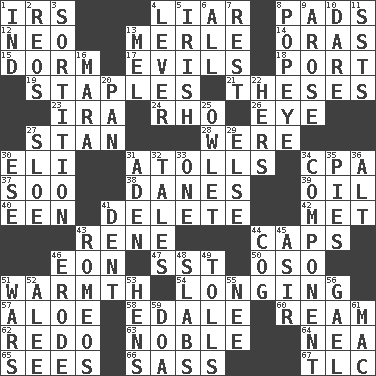 ACROSS 1. Big collection agency 4. One who doesn't tell the truth 8. Groovy apts. 12. Modern: prefix 13. Haggard of country music 14. Mouths or openings 15. Dormintory (informal) 17. Vices 18. Left side of a ship or aircraft 19. Paper fasteners 21. College papers 23. Lyricist Gershwin 24. 17th letter of the Greek alphabet 26. Sight organ 27. Comedian Laurel of Laurel & Hardy 28. Past tense of be (plural) 30. Biblical high priest 31. Ringlike coral islands and reefs 34. Accounting whiz (abbr.) 37. "Barney Miller" actor Jack 38. Natives or inhabitants of Denmark 39. Petroleum 40. Car or cant ending 41. Keyboard key 42. Was introduced to 43. French philosopher Descartes 44. Balmoral and tarboosh 46. Period of immesurable duration 47. Fast jet (abbr.) 50. Bear (Spanish) 51. Heat 54. Yearning 57. Medicinal plant 58. Peak District village in England 60. 480, 500 or 516 sheets of paper 62. Do over again 63. Having high moral qualities 64. Teachers' org. 65. Observes 66. Backtalk 67. Affectionate concern, for short DOWN 1. Indiana (abbr.) 2. Vintage cars 3. Casting lots 4. Prying instrument 5. From or relating to Ireland 6. 100% 7. State of inaction 8. Wimpy's pal 9. Came up 10. Have the gumption 11. Fast planes 13. Cartoonist voice _ Blanc 16. Hindu Mythology: god of death 20. Baking dish 22. Possessive pronoun 25. A small or young owl 27. A type of plum 29. Otherwise 30. Compass dir. 31. Arabian gulf 32. Falsehoods 33. Single 34. Part 35. Sliced desserts 36. Keyboard modifier key 41. Gouge 43. Lover boys 44. Gear tooth 45. SW Saudi Arabia district 46. Wear away 48. Thick slices 49. For Whom the Bell _____ 51. Armed conflicts 52. Toward shelter 53. Coop moms 55. Born 56. Highlander 59. ___ good deed 61. Apple computer (short form)