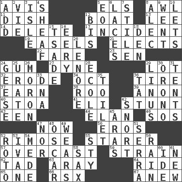 ACROSS 1. Advice 5. Raised railways 8. Leather borer 11. Food container 12. Water vessel 13. Area sheltered from the wind 14. Erase 17. Event 19. Artist's stands 21. Opts 22. Conductor's collection 23. Elected rep. 24. Chewing product 27. Centimeter-gram-second unit of force 29. Car dealer's back yard 32. Wear away 34. Sep. follower 36. Become fatigued 37. Merit 38. Friend of Pooh 39. Soon (poet.) 40. Portico 41. Connecticut Ivy Leaguer 42. Difficult or unusual or dangerous feat 43. Car or cant ending 44. Style 46. Distress signal 47. Immediately 50. Greek god of love 52. Full of chinks, cracks, or crevices 55. A viewer who gazes fixedly 57. Cloudy 59. Put through a sieve 62. Small boy 63. Like ___ of sunshine 64. Travel on an animal 65. Single 66. Acura sports coupe 67. Afresh DOWN 1. Increase 2. Compete 3. Small island 4. To gather and bind into a bundle 5. A really long time 6. Shoestrings 7. Vertical member of a panel or frame 8. Actor Baldwin 9. Left 10. Allows 12. Altar cloth linen 15. Sadhe (variant) 16. Suggestive of the supernatural 18. Lair 20. Poe poem 24. Honkers 25. A salt of uric acid 26. Person of subnormal intelligence 28. Learning spot: Fr. 29. "_ and Lucy" (Charlie Brown theme song) 30. U. of Maine site 31. Portable shelters 33. Heredity factor (abbr.) 35. Bathroom plumbing fixture 36. Make lace 42. Derisive sound 45. Caspian sea tributary 47. And not 48. Motion picture award 49. Erodes 51. Spanish missionary in California 52. Printing process, for short 53. "Terrible" tsar 54. Ancient Persian 55. Filthy place 56. Precipitation 58. Saxophone 60. Binary compound 61. ___ Haven, CT