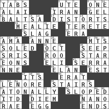 ACROSS 1. Bar bills 5. Shoshoni 8. Single 11. Jai _ 12. SW Asia republic 13. Set 14. Greek mezzo-soprano Agnes 17. What propaganda does 19. Ear of corn 21. Cylindrical with tapered ends 22. Volcanic refuse 23. Epoch 24. Housemaid (var.) 27. Queen of England 1702-14 29. Mountains (abbr.) 32. Having a sole or soles 34. Sep. follower 36. Ooze 37. Indian titles of respect 38. Friend of Pooh 39. Play the lead 40. Immeasurably long periods of time 41. Connecticut Ivy Leaguer 42. Spanish missionary in California 43. Compass dir. 44. Flair 46. Eastern Standard Time (abbr.) 47. It is 50. Part of Q.E.F. 52. Poe poem 55. Flight of steps 57. Lacking a tonal center or key 59. Had an oblique or slanted direction 62. It would 63. South Vietnam president (1954) 64. Billionth: prefix 65. Actress Charlotte 66. Oval reproductive body of a fowl 67. Conclusions DOWN 1. Bar bill 2. According to 3. Lip ointment 4. Settings 5. RI univ. 6. Clothes sense 7. Keyboard key 8. Legendary monster 9. Remaining after all deductions 10. Otherwise 12. Binary compound 15. Vegetable dish 16. Actor Alda or Thicke 18. Mouth or opening 20. Dismiss 24. NE Netherlands city 25. Person of subnormal intelligence 26. Place in a line 28. Learning spot: Fr. 29. Distance measurement (Brit.) 30. Pulls apart 31. Small fatty European fish 33. Double-curved letter 35. Bathroom plumbing fixture 36. Compass dir. 42. Slow-paced one 45. Caspian sea tributary 47. Electrically charged atom 48. Buy and sell 49. Former Milwaukee Brewers owner Bud 51. Heavy duty weighing machine 52. Den 53. Singer James 54. Thickened enlargement 55. Symbol (abbr.) 56. Connect, as a bridge 58. Part of a journey 60. Conclude 61. Two (Sp.)