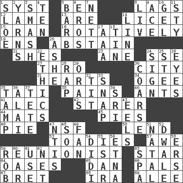 ACROSS 1. System (abbr.) 5. Benjamin's nick name 8. Straggles 12. Unable to walk 13. "We ___ not amused" (Victoria) 14. It is permitted: Lat. 15. NW Algerian seaport 16. Rotating or pertaining to rotation 19. Followers of ems 20. Choose not to consume 21. "______ My Girl" (Turtles hit) 23. One (Scot) 24. Compass dir. 27. Through, poetically 30. Municipality 31. Centers 34. Double curve, resembling the letter S 35. Jacques of French films 38. Aches 40. Pismires 41. Actor Baldwin 42. A viewer who gazes fixedly 44. Floor protectors 45. Sliced desserts 46. Sliced dessert 47. Science/research agcy. 50. Grant temporary use of 53. Sycophants 57. Deep reverence 59. One who advocates reunion 63. Play the lead 64. Fertile tracts in a desert 65. One of the 12 tribes of Israel 66. Friends 67. Cy Young winner Saberhagen 68. Lyricist Gershwin 69. Toward shelter DOWN 1. A type of plum 2. Entertaining tales 3. Box-office sellout 4. Nine, plus one 5. Sharp remark 6. Greek god of love 7. Remaining after all deductions 8. 54 in ancient Rome 9. Adept person 10. Set 11. Filthy place 14. Actor's bit 17. American Automobile Association (abbr.) 18. Shallow baking pan 20. American tennis player Robert 22. Moral principles 24. Public display of a written message 25. Proofreading order 26. Snake ____ (dice throw) 28. Hit sharply and swiftly 29. Mouths or openings 30. Unrefined 32. Teat (slang) 33. Fastener 35. Pack (down) 36. Mountain range southwest of Kyrgyzstan 37. Wig 39. Indian title of respect (Mr.) 43. Snakelike fish 47. Nuclear Threat Initiatives 48. "Barney Miller" actor Jack 49. Air blower 51. Brizilian seaport 52. A sleeping potion; an opiate (poet.) 54. "You Light Up My Life" star Conn 55. Austrian river, tributary to the Danube 56. Inactive volcano in Sicily 58. Celtic language 59. Director Reiner 60. Hearing organ 61. Purpose 62. Fish or hair follower 63. Health resort
