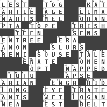 ACROSS 1. For fear that 5. Coat; cloak 8. Krazy ___ of comics 11. Nick name for Arthur 13. Grow older 14. Pale green bean 15. Shops 16. Cartoonist voice _ Blanc 17. Northwest Algerian city 18. Parent Teacher Association (abbr.) 19. Drink excessively 21. From or relating to Ireland 22. Adolescent 24. Elected reps. 25. Main course 27. Epoch 29. Soon (poet.) 30. Disparaging remarks 32. Painter Guido (1575-1642) 33. Lush 35. Story 39. Related on the mother's side 41. Presage 42. Elect 43. Slept 45. Ballerina skirt 48. Domed church section 49. Believer in; advocate of (suffix) 50. Engineer (abbr.) 52. To free from 55. Protracted 56. Sight organ 57. Feeling or showing extreme anger 59. Pismires 60. Soggy 61. Utah city north of Ogden 62. Teachers' org. 63. Eastern Standard Time (abbr.) 64. Waist strap DOWN 1. Desk light 2. Part of Q.E.F. 3. Ski resort town in Vermont 4. Teat (slang) 5. Pack (down) 6. Double curve, resembling the letter S 7. Set 8. Japanese brewing company 9. Collect or gather 10. Hyperbolic tangent 12. First name in cosmetics 14. Old wives' tales, e.g. 20. Single 21. Austrian river, tributary to the Danube 23. Bert's buddy 25. Hearing organ 26. Compass dir. 27. Raised railways 28. Sorrow 30. Institute legal proceedings 31. Obstructs or blocks passage 33. Plant excrement 34. Baseball player Mel 36. Electrical Measurement 37. Area sheltered from the wind 38. Conclusion 40. Part of speech 43. Tired old horse 44. Showery time 45. Marketplace scale 46. National forest in Provo, Utah 47. Labels 49. ____ Jay Lerner 50. Snake ____ (dice throw) 51. Remaining after all deductions 53. Slanted text style (abbr.) 54. Scratch 56. She-sheep 58. Director Reiner