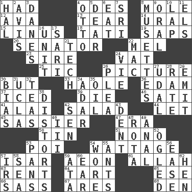 ACROSS 1. Possessed 4. Lyric poems 8. Undercover agent 12. Actress Gardner 13. Pull apart 14. Mountain range 15. "_ and Lucy" (Charlie Brown theme song) 18. Jacques of French films 19. Plant excrements 20. Legislator 22. Cartoonist voice _ Blanc 23. Father 24. Large container 25. Nervous spasm 26. Photo 30. With the exception that 33. White Person, in Hawaii 36. Dutch treat 37. On the rocks 39. Expire 40. Suttee (variant) 41. Mountain range southwest of Kyrgyzstan 42. First course 44. Allow 45. More impudent 47. Epoch 50. Metal container 51. Words to Nanette 53. Luau course 54. Electrical Measurement 57. Austrian river, tributary to the Danube 59. Age 61. Assad's deity 63. Monthly bill 64. Small pie 65. Compass dir. 66. Backtalk 67. Ancient Greek god of war 68. Lair DOWN 1. Actor Linden 2. Deliberation 3. Natives or inhabitants of Denmark 4. Von Bismarck 5. Letter starter 6. Erode 7. _ Lanka 8. French bagpipes 9. Of the mouth 10. Pet locale 11. Raised railways 16. A single undivided whole 17. Indian skirt 21. Georgia ____ (Atlanta school) 22. Big _ 24. Compete 26. Entreaty 27. Freehold land 28. Assign a rank or rating to 29. Send forth 30. Prejudice 31. Southern CA. univ. 32. Beverages made from leaves 34. The sixth month of the Jewish calendar 35. Petroleum 38. What propaganda does 42. Elected rep. 43. Gouge 46. One more than two 48. Roll call or roster of names 49. Of or related to the anus 52. Stared at amorously 53. Zero-star reviews 54. Had on 55. Pismires 56. Comfort 57. Big collection agency 58. Ocean 59. _ moment's notice (2 wds.) 60. Ewer handle 62. Layer