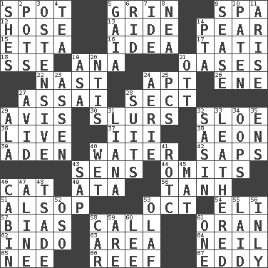 ACROSS 1. Specific locale 5. Smile widely 9. Health resort 12. Flexible conduit 13. Helper 14. Lightbulb-shaped fruit 15. Singer James 16. It may be bright or harebrained 17. Jacques of French films 18. Compass dir. 19. Santa ___, CA 21. Fertile tracts in a desert 22. Political cartoonist Thomas 24. Fitting 26. Compass dir. 27. Slender Brazilian palm 28. Religious group 29. Opinion 30. Runs notes together 32. A type of plum 36. Not recorded 37. One more than two 38. Period of immesurable duration 39. An important port of Yemen 40. Wetness 42. Plant excrements 43. Elected reps. 44. Leaves out 46. Domesticated feline 49. _ moment's notice (2 wds.) 50. Hyperbolic tangent 51. Columnist Joseph or Stewart 53. Sep. follower 54. Connecticut Ivy Leaguer 57. Prejudice 58. Give a ring to 61. NW Algerian seaport 62. _ china 63. Type of rug 64. Famous astronaut Armstrong 65. Born 66. Coral ridge 67. Whirlpool DOWN 1. "______ My Girl" (Turtles hit) 2. Cooking vessels 3. Clearly or manifestly demonstrative 4. Beverage made from leaves 5. Greek goddess of the earth (variant) 6. To free from 7. Binary compound 8. Teachers' org. 9. Gospel singer Marvin 10. Eucharist need 11. Get up 14. Parent Teacher Assoc. 19. White ___ sheet 20. Nuclear Threat Initiatives 21. Baseball player Mel 23. NE Netherlands city 24. Nest on high 25. Personal Computers (abbr.) 27. Enthusiastic 28. Costumes for special activities 29. According to 31. Woody, climbing, usually tropical plant 32. Indian antelope 33. Resembling or made to resemble leather 34. I made a mistake 35. Followers of ems 40. Dripping 41. College mil. group 43. Plant excrement 45. Floor covering 46. Apartment or room in a ship 47. Place in a line 48. Sadhe (variant) 52. Bear (Spanish) 53. Norwegian king 55. Put down 56. Inwardly 58. 4-wheeled motor vehicle 59. "We ___ not amused" (Victoria) 60. Area sheltered from the wind 61. Single