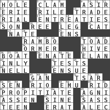 ACROSS 1. Opening into or through something 5. Burrowing marine mollusk 9. SW Saudi Arabia district 13. 4th largest of the Great Lakes 14. Cause heat under the collar 15. Barter 16. Monetary unit of Yemen 17. Pleas 19. Male offspring 20. To riddle 21. Part of a journey 22. Feline 23. Nathan's nickname 25. Followers of ems 26. Role for Stallone 30. Frog relative 34. Channel Islands abalone 35. Hub of activity 36. Water vessel 39. Maternal 42. Liveliness 43. In an inward manner 44. Trials 46. 1994 drama film starring Jodie Foster 47. Follow as a consequence or result 48. Separate the seeds from cotton 51. Russian ruler of old 54. Elected rep. 57. _ de Janeiro 58. Australian flightless bird 60. To free from 62. Conciliate 65. Hindu god of fire 66. NE Netherlands city 67. Trig term 68. Backtalk 69. Adolescent 70. Part of Q.E.F. 71. Actor Baldwin DOWN 1. Possessive pronoun 2. Constellation of myth 3. Woody, climbing, usually tropical plant 4. Snakelike fish 5. Algonquian 6. Actor's bit 7. Keyboard modifier key 8. Haggard of country music 9. Tate display 10. Ketch in the Levant 11. The main thing one is thinking about 12. Remainder 15. Labels 18. Car or cant ending 20. Stern 24. TNT 27. Madame (abbr.) 28. Benjamin's nick name 29. Speak pompously 30. College papers 31. Petroleum 32. Actress Gardner 33. Lair 36. Storage container 37. Single 38. Everything 40. "___ Little Indians" 41. Curvy letter 45. Ballerina skirt 48. Broad smile 49. Small island 50. Annoying sound 52. Therefore, facetiously 53. Wash lightly 54. Argument over a trivial matter 55. Celtic language 56. Characteristic smell of wine 58. Inactive volcano in Sicily 59. Confront 61. Flat circle 63. Writing instrument 64. Wind 65. White ___ sheet